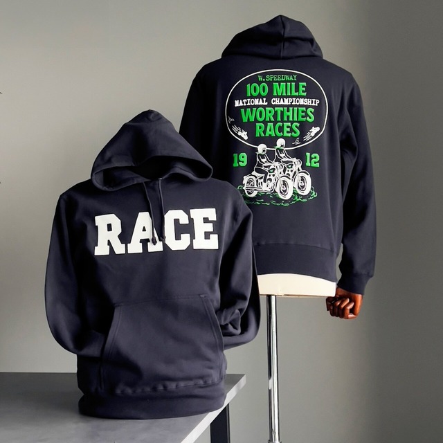フロントのRACEプリントが印象的な10オンス裏パイル生地のフーディー。 バックにはチャンピオンシップをイメージしたグラフィックプリント。 【素材】 コットン100% 【サイズスペック】 Mサイズ:身丈67cm/身幅55cm/肩幅48cm/袖丈60cm Lサイズ:身丈71cm/身幅58cm/肩幅52cm/袖丈61cm XLサイズ:身丈76cm/身幅63cm/肩幅55cm/袖丈62cm