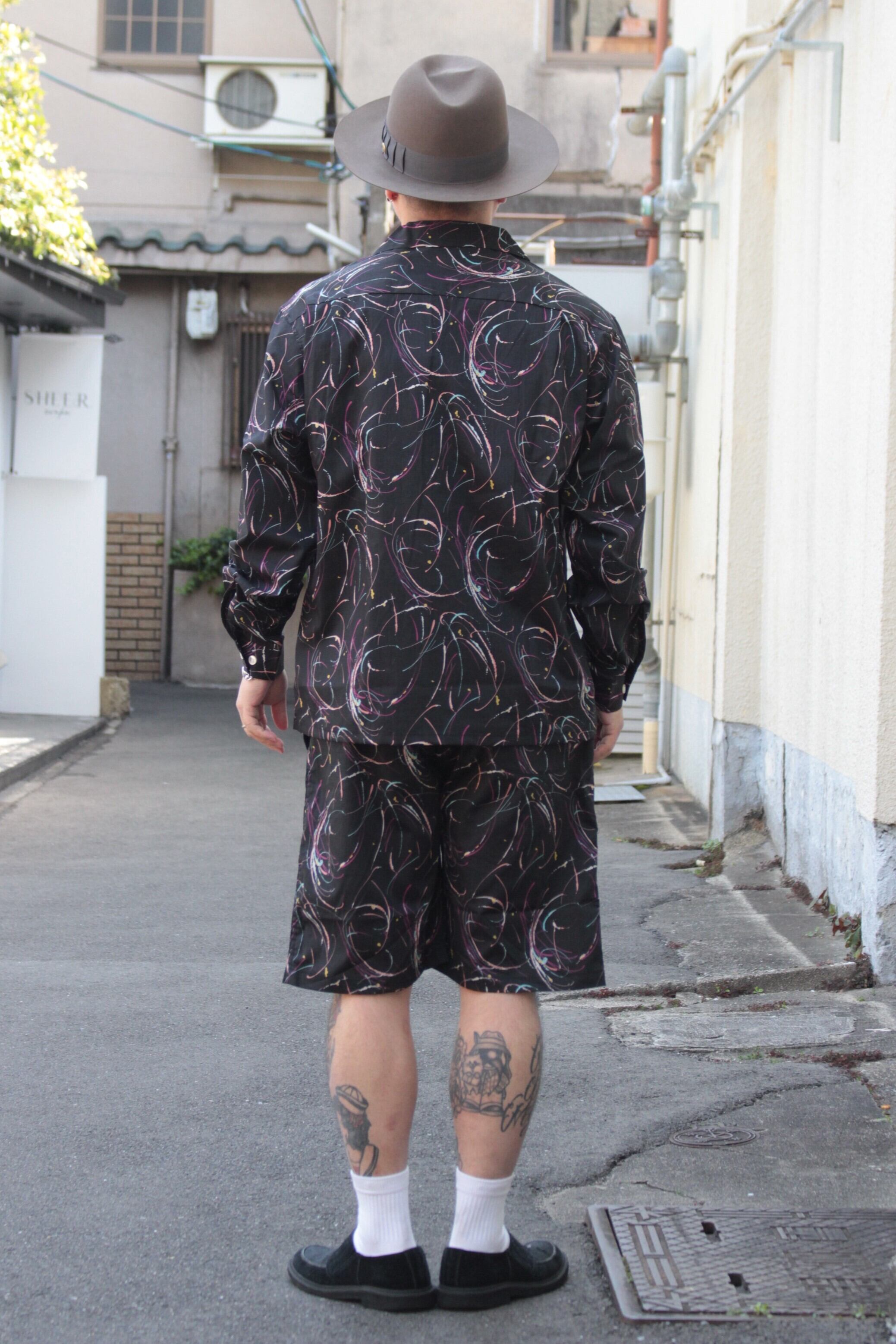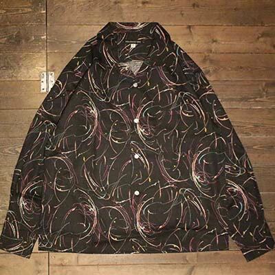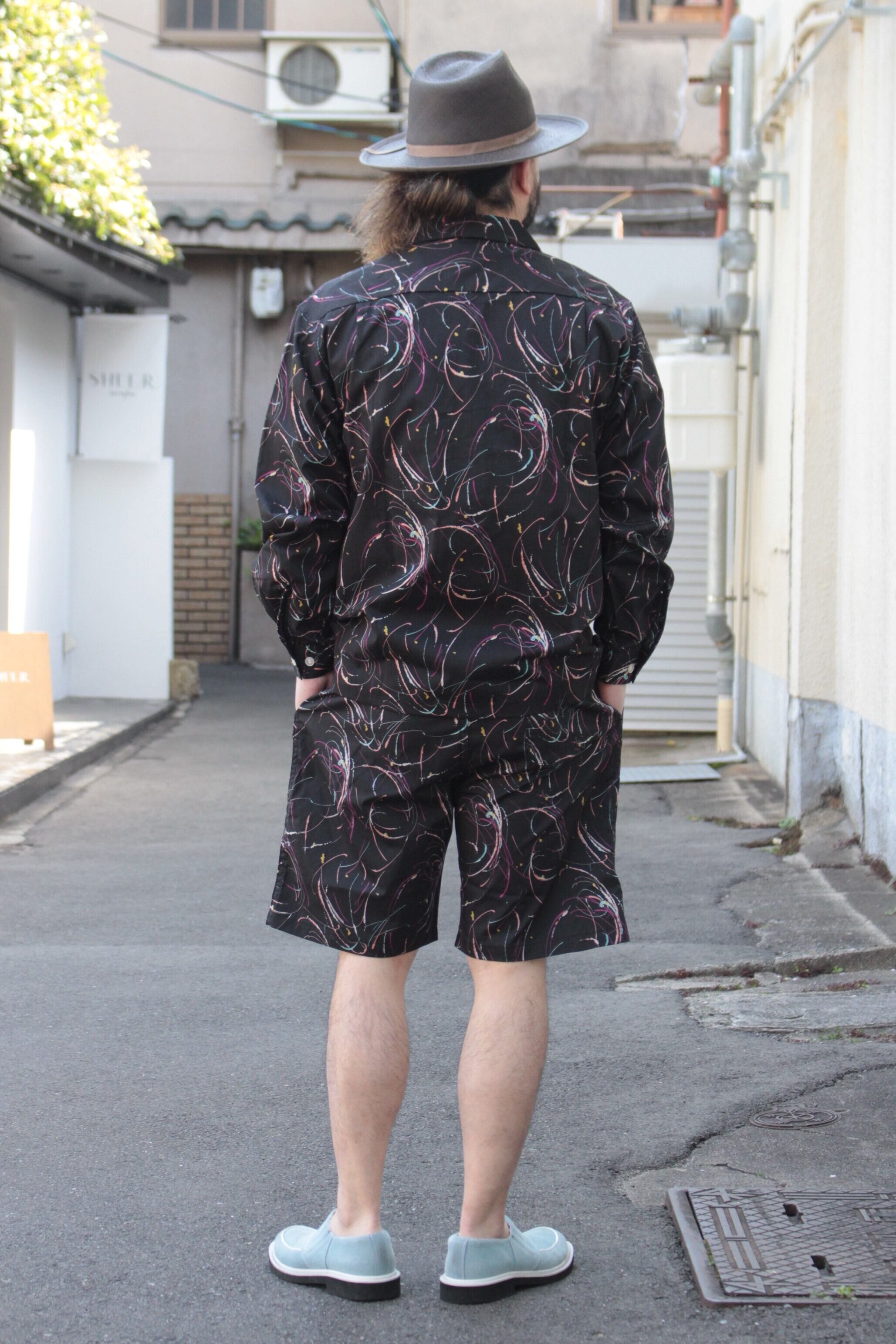 カラフルなインクを飛ばしたようなアブストラクトパターンの、ミッドセンチュリーテイスト・コットンシャツ。
