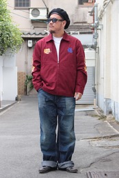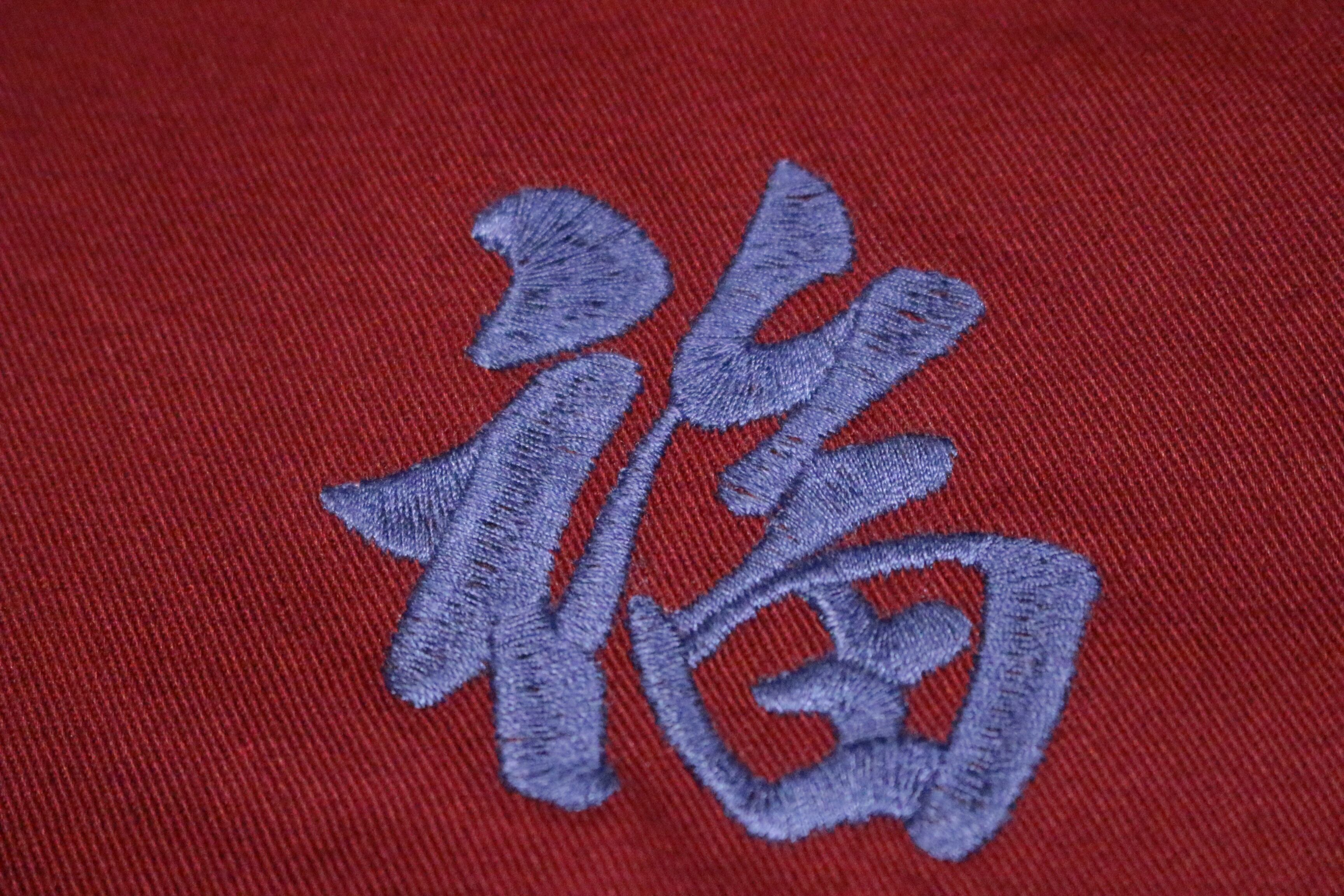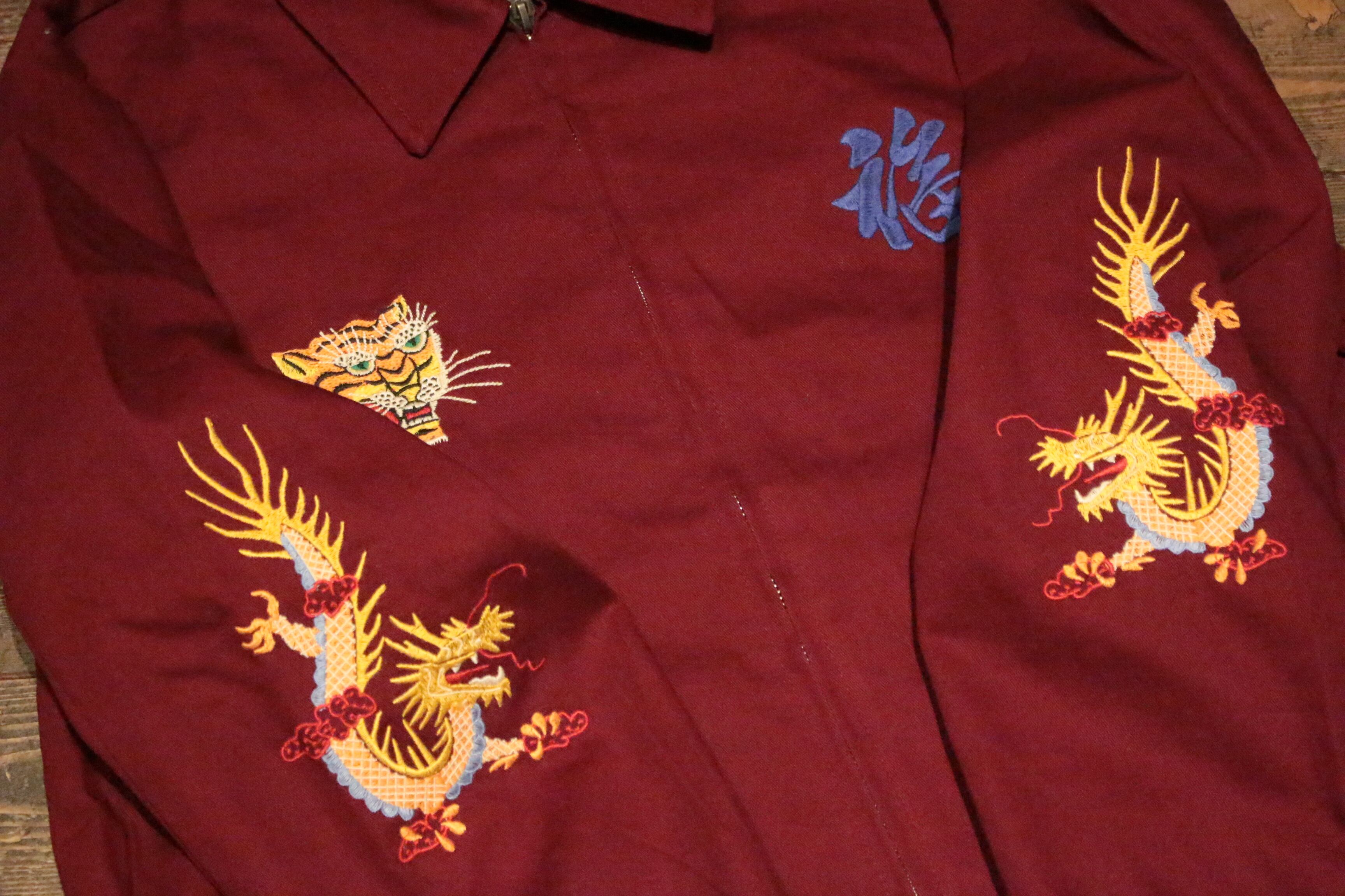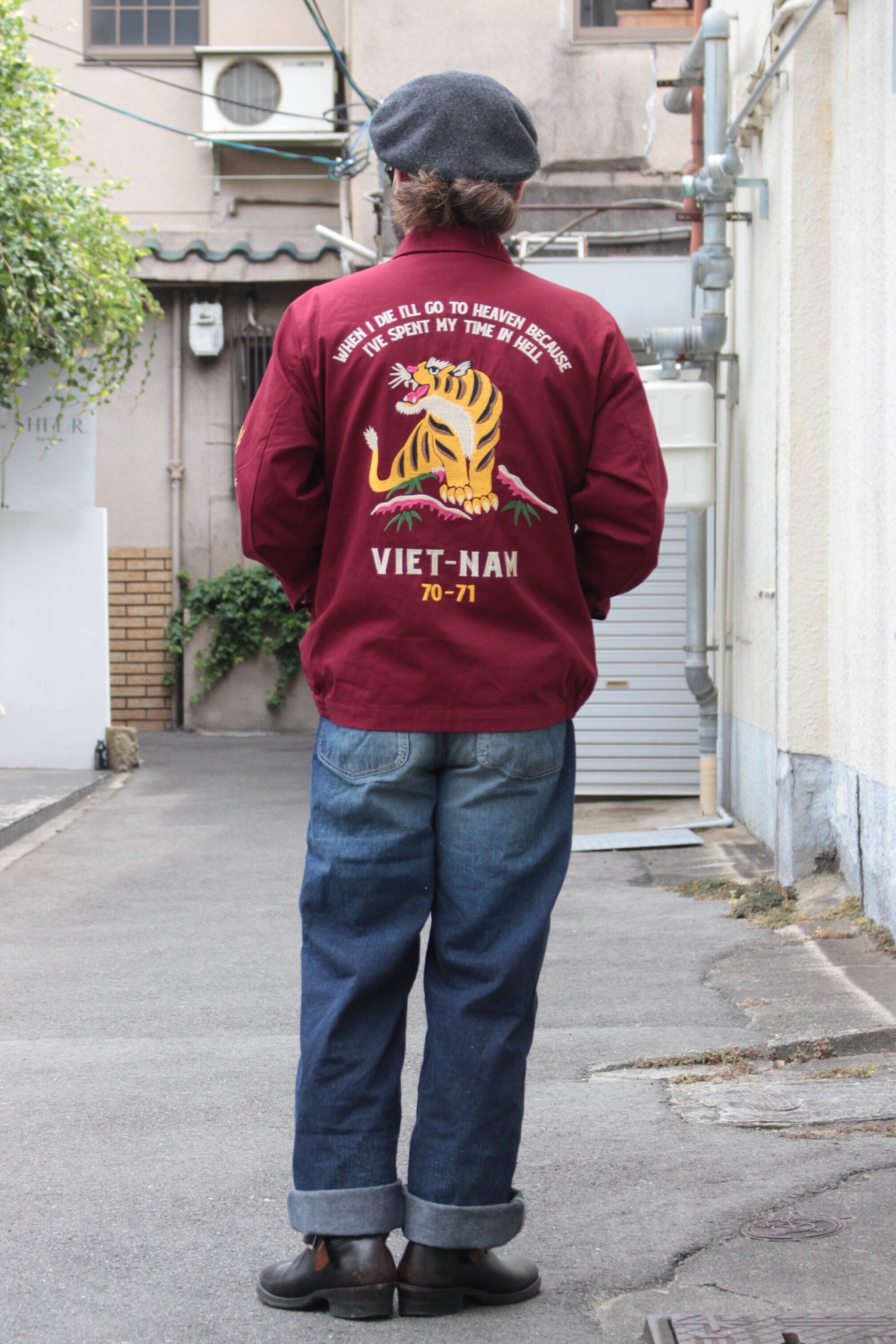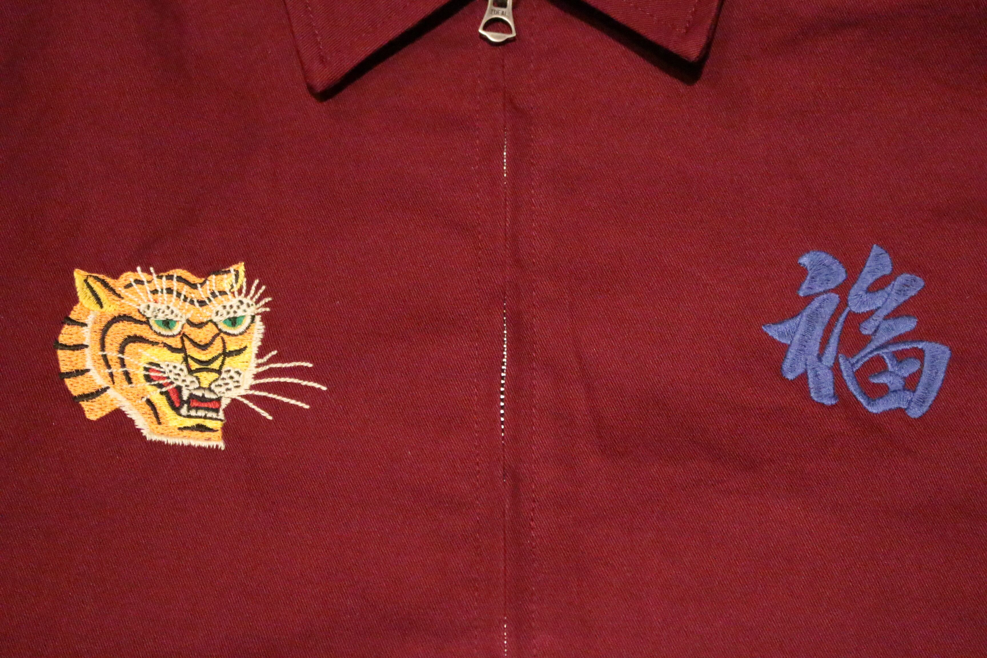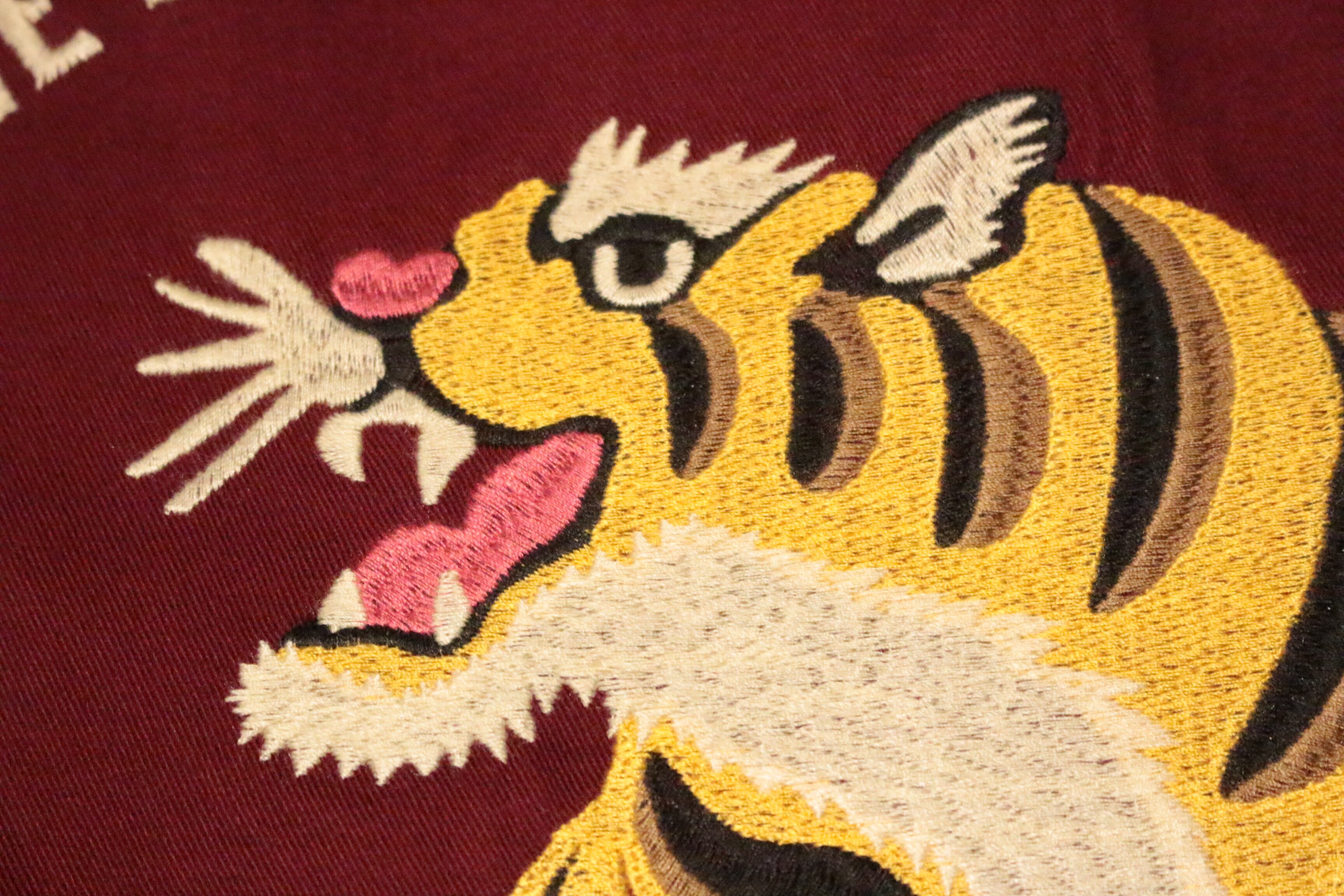 肉厚で丈夫なコットンツイルを使用したベトジャン。高級感のあるシルバーカラーの裏地を取り付け、着用時に滑りの良いスムーズな着脱が可能。ヴィンテージベトジャンの柄をイメージし、全体に大きくインパクトのある虎柄を採用。手振り風の刺繍で仕上げている。