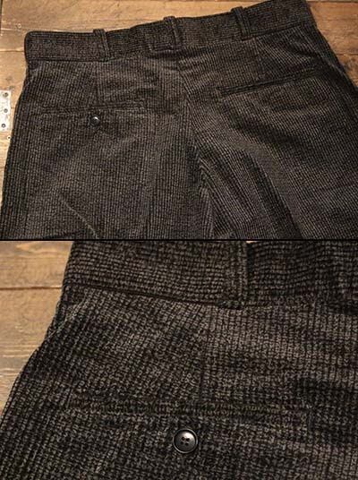 ダブルヘムやヘリンボーンスレキ、フロントのメタルボタン、左バックポケットの