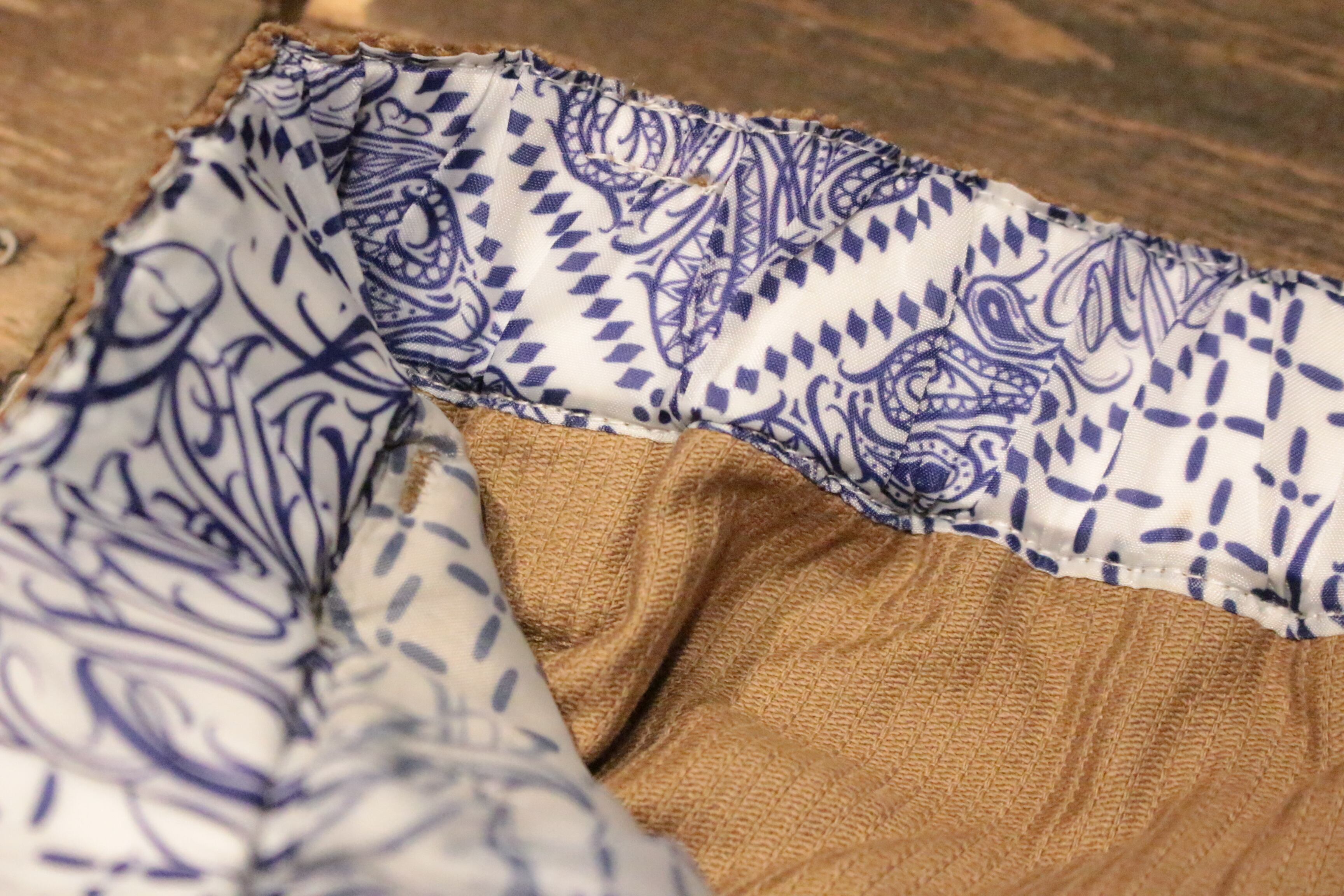 ベルトループも付いているのでベルトも使用可能です。ウエスト部分の内張りとサイドポケット内にはBANDANA総柄の生地を使用