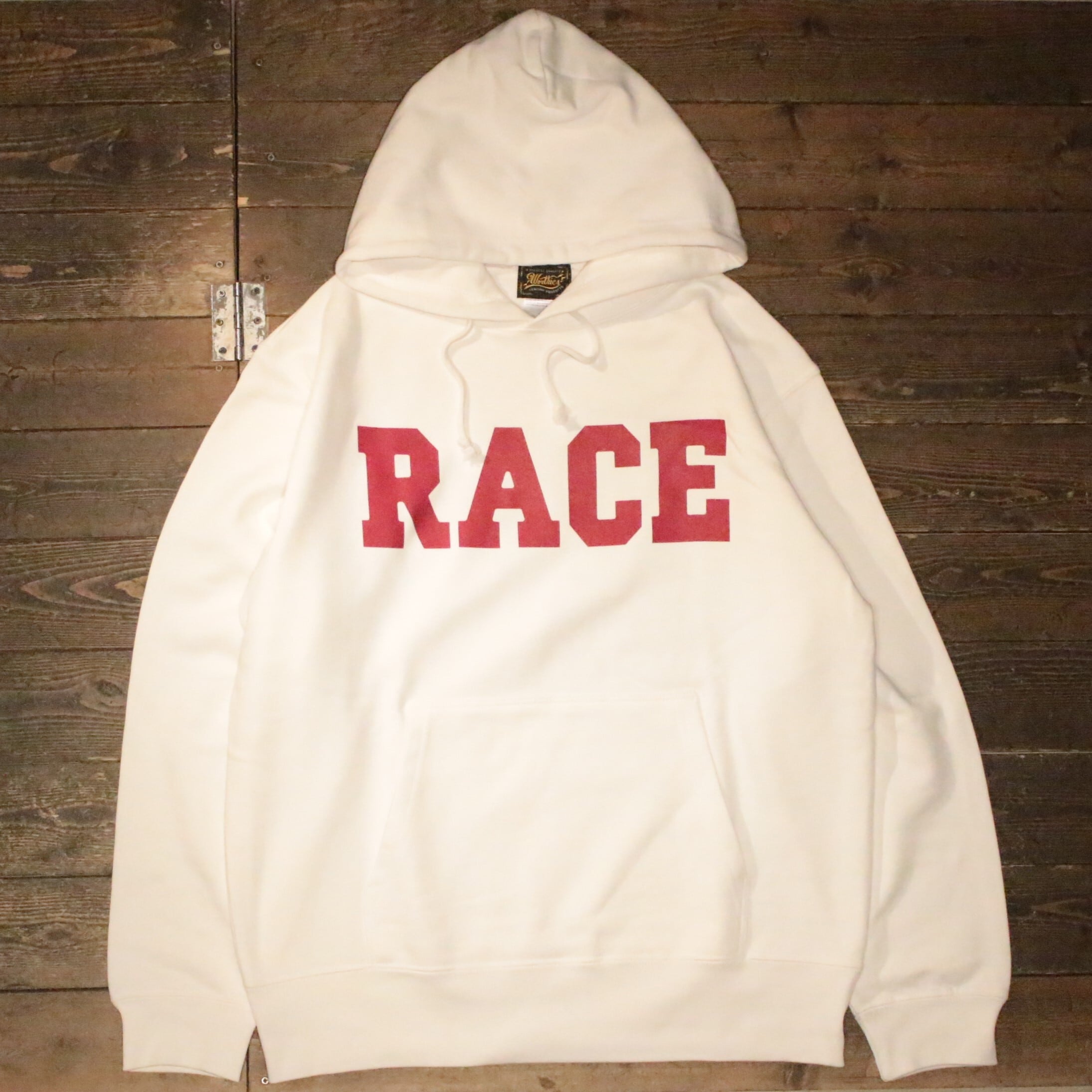 フロントのRACEプリントが印象的な10オンス裏パイル生地のフーディー。