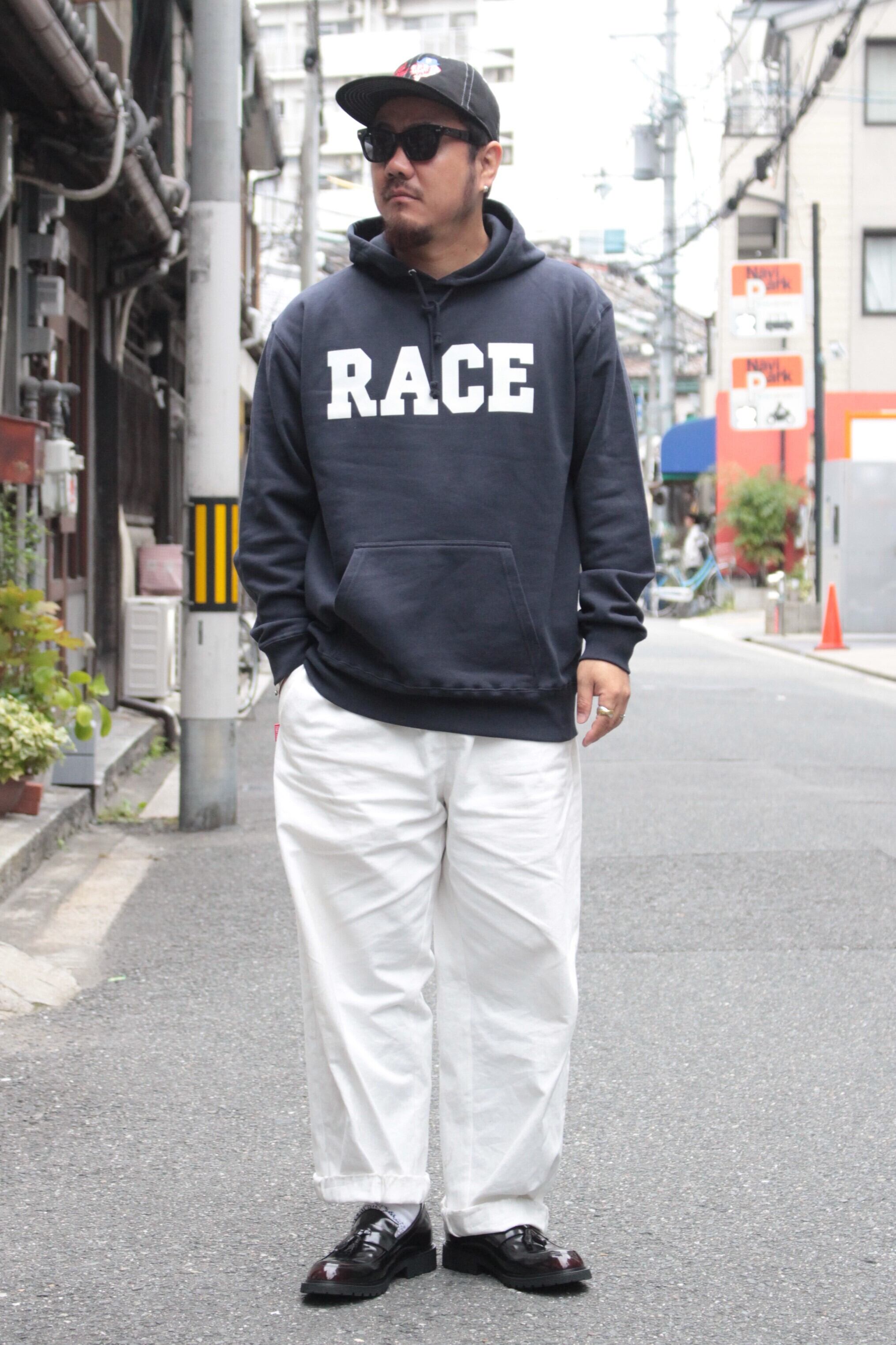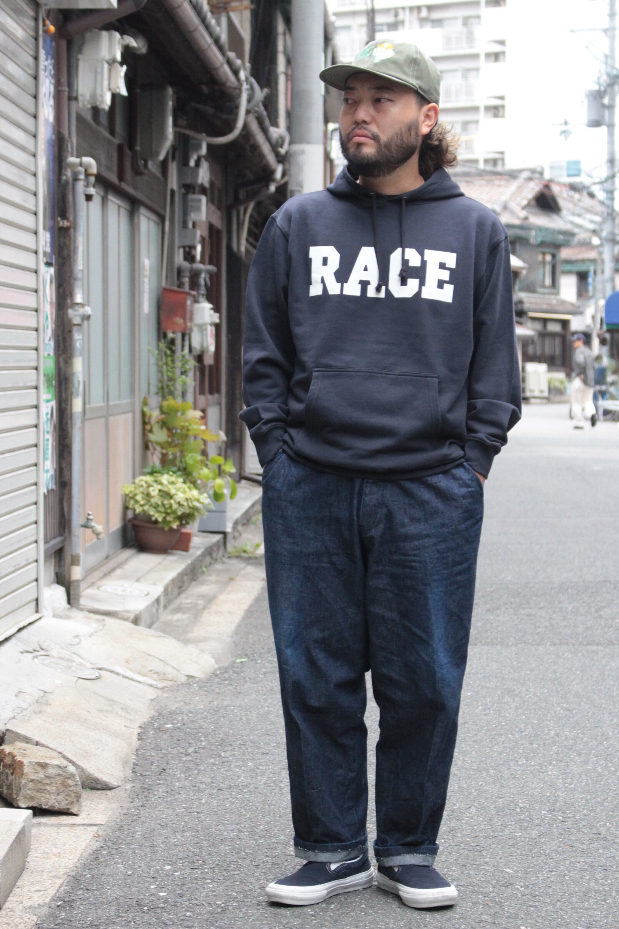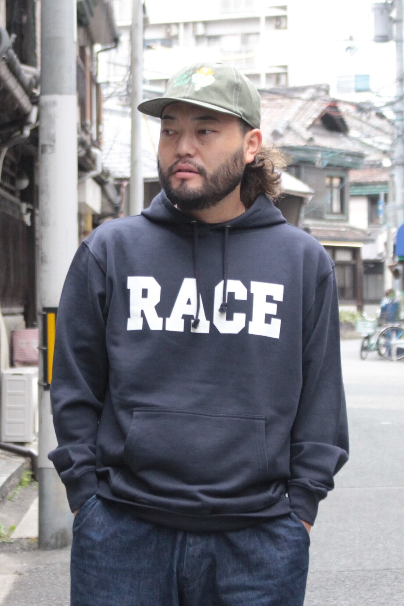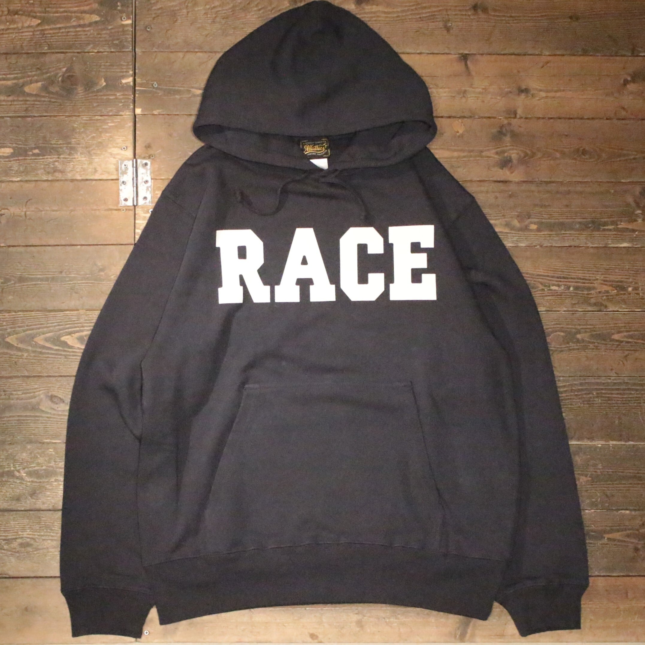 フロントのRACEプリントが印象的な10オンス裏パイル生地のフーディー。