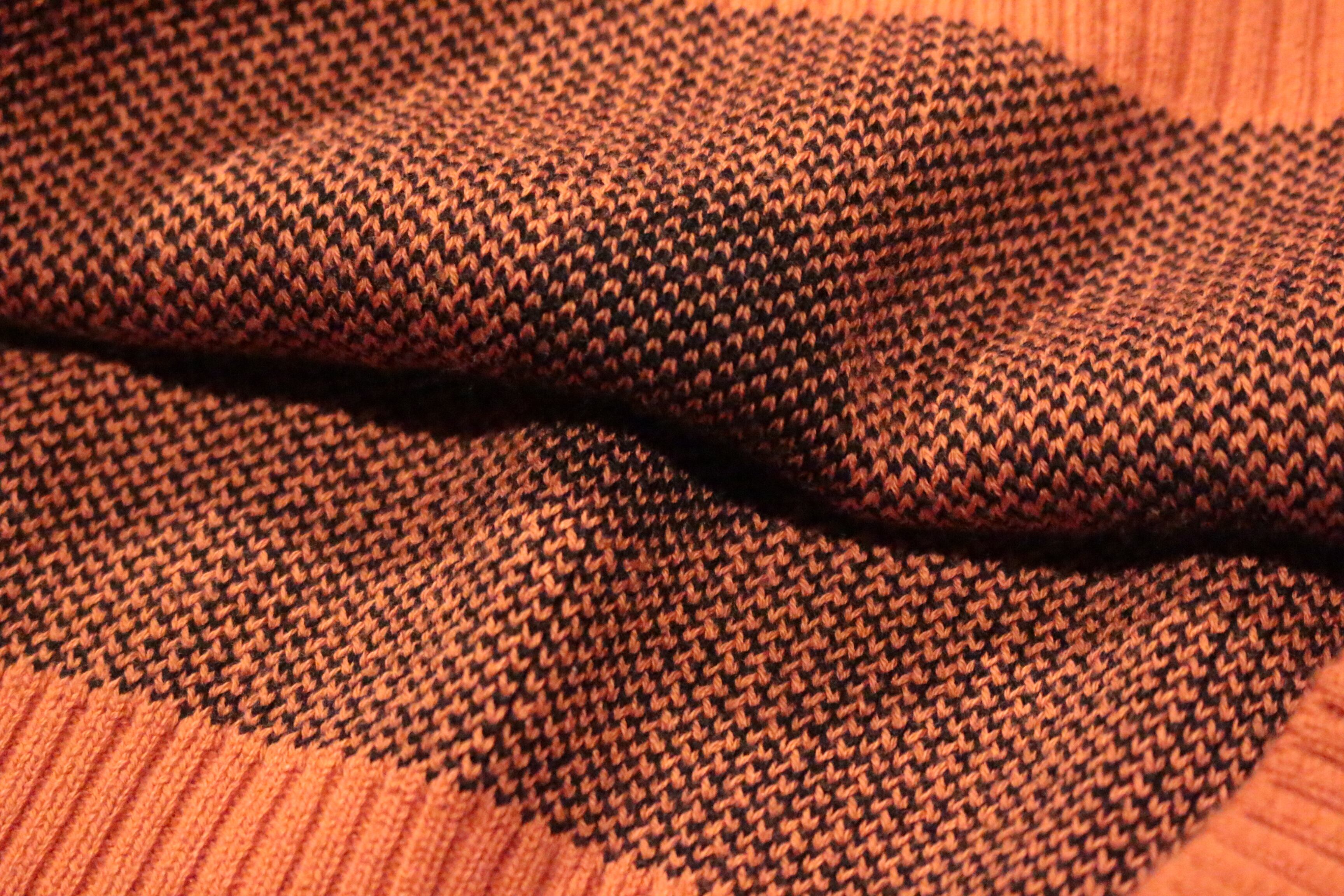 フレイムパターンを大胆に編み込んだツートーンカラーが印象的なコットン100%のオリジナルニットセーター。