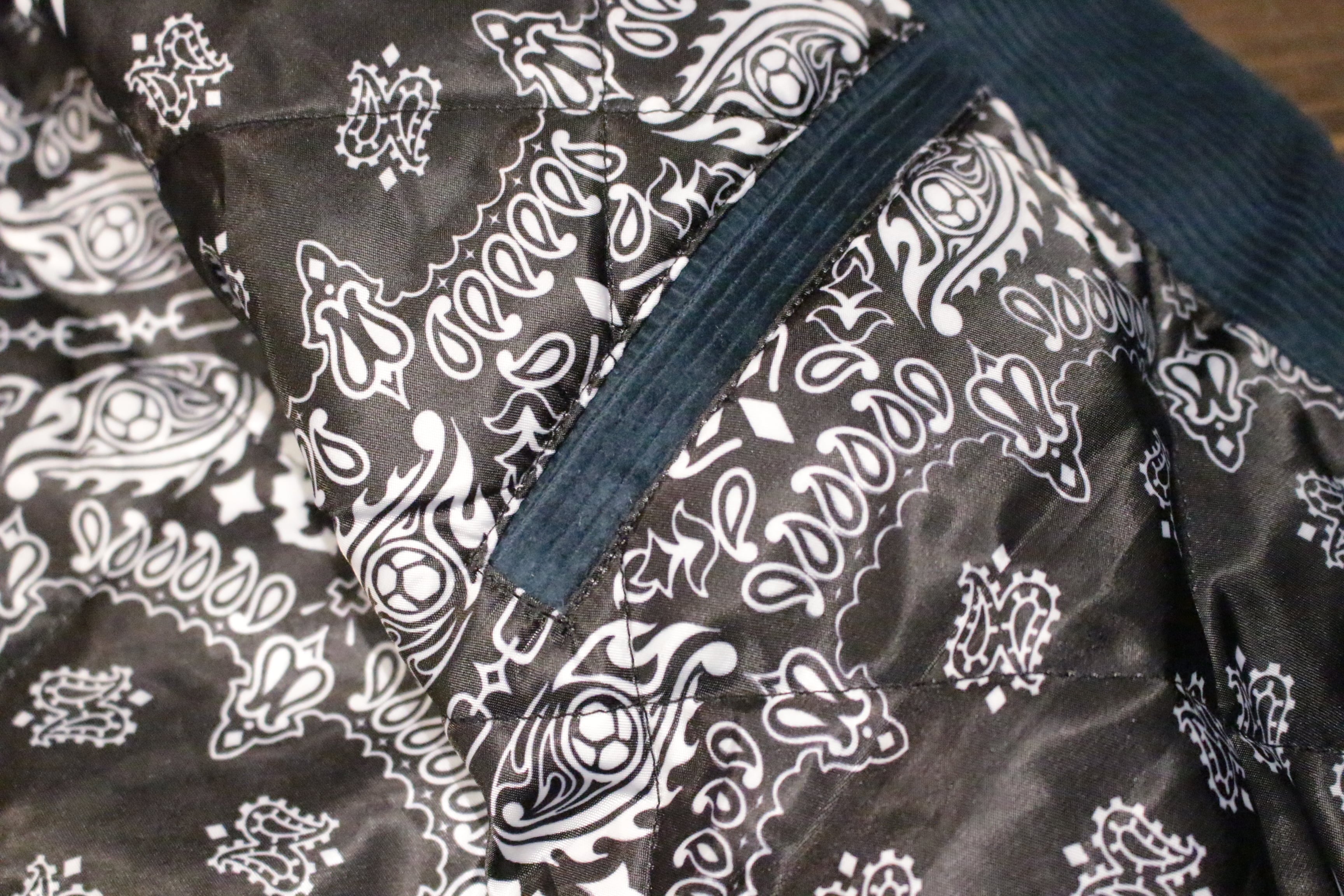 ポリエステル地のBANDANA総柄裏地はSLEEVEまで貼り合わせた