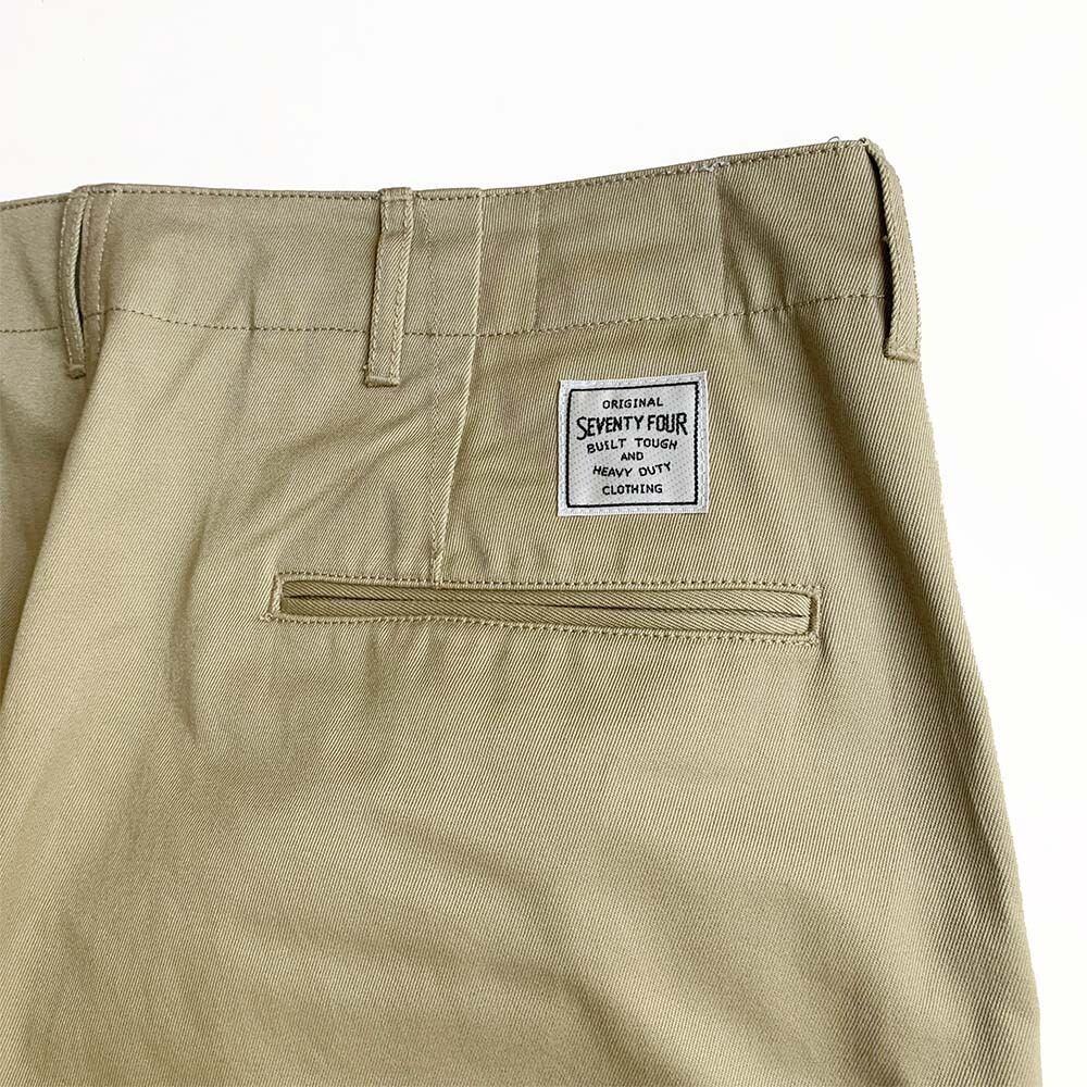 ビンテージスタイルチノパンツ、 100% コットンヘビーウエイトチノクロス、 ボタンフロント、 ベルトループウエストバンド、 スラントサイドポケット、 右前コインポケット、 ウェルトバックポケット、 SEVENTY FOURロゴ刺繍、 リラックスフィット