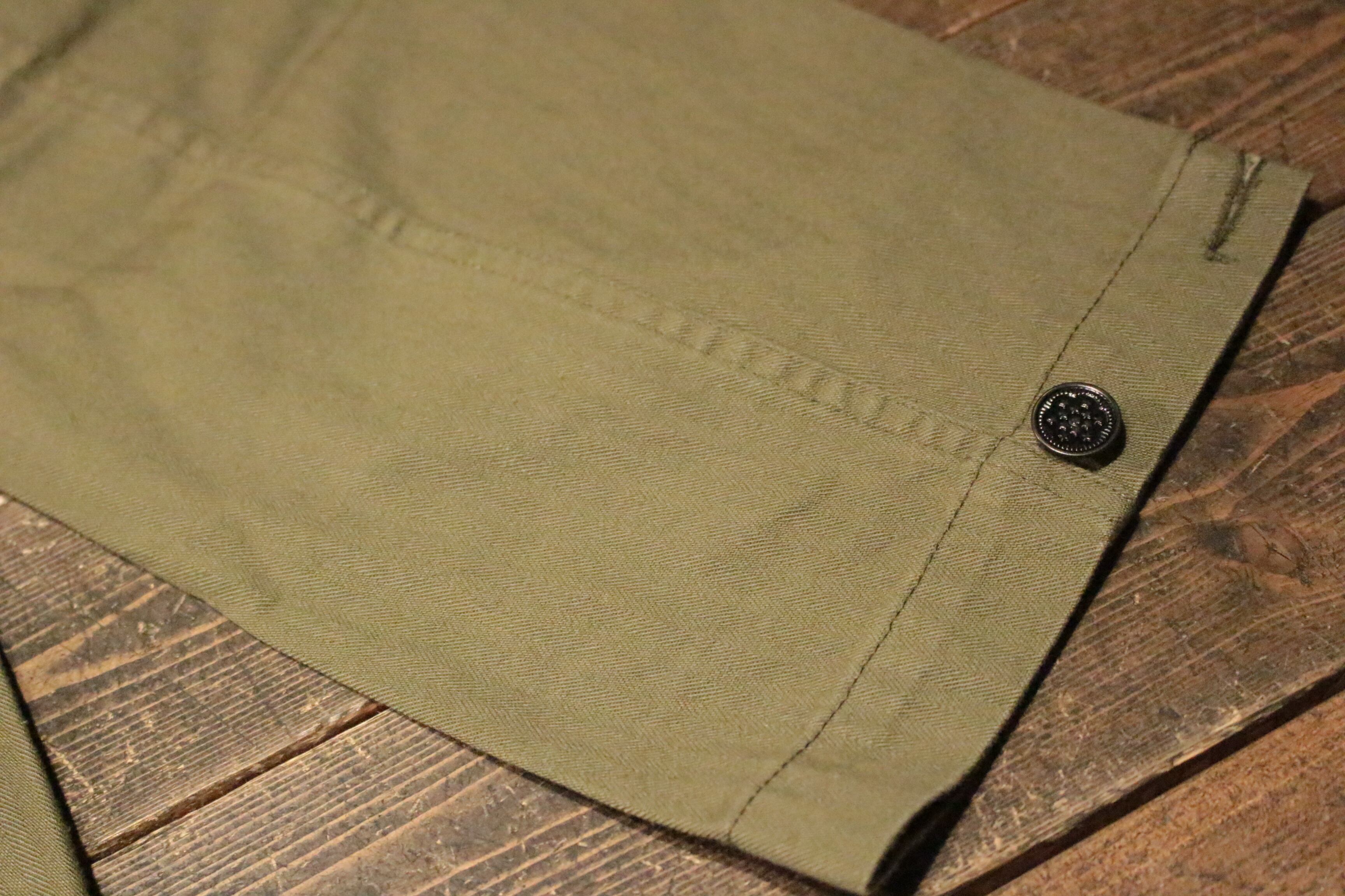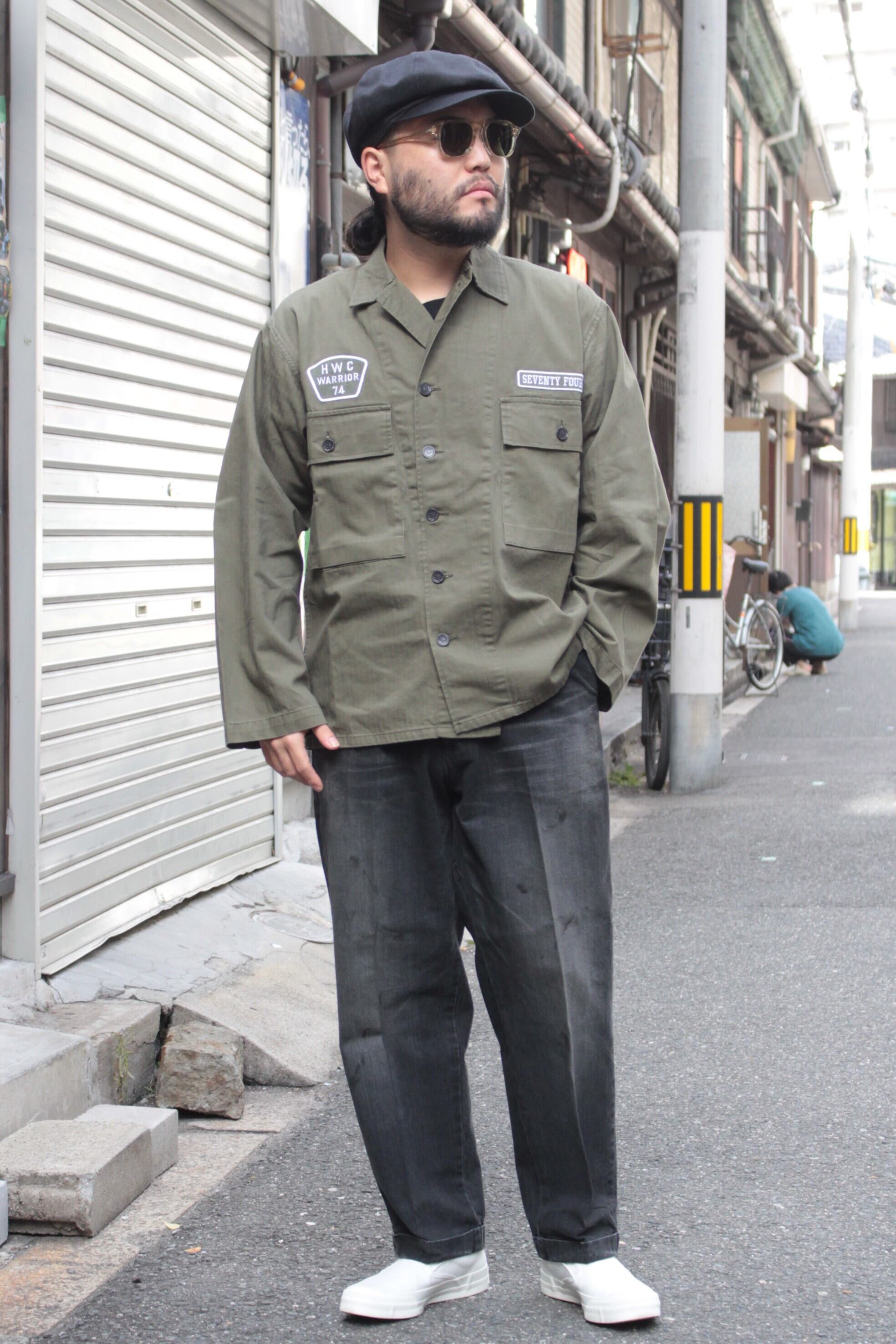 ミリタリースタイルジャケット、 コットンヘリンボーンファブリック、 フロントボタン、 袖先ボタン、 両胸大型パッチポケット+ボタン、 両胸SEVENTY FOURロゴ刺繍ワッペン