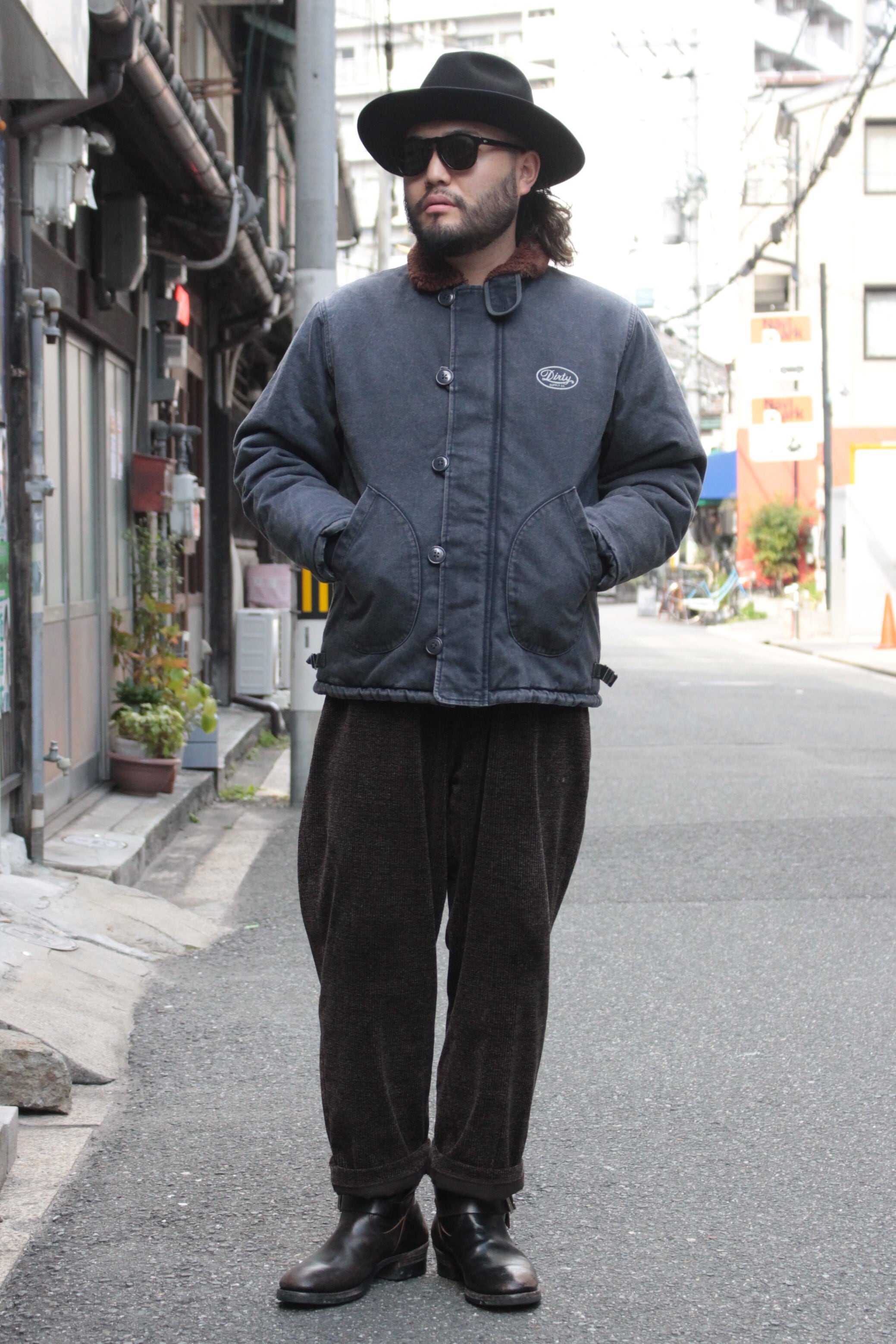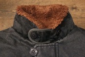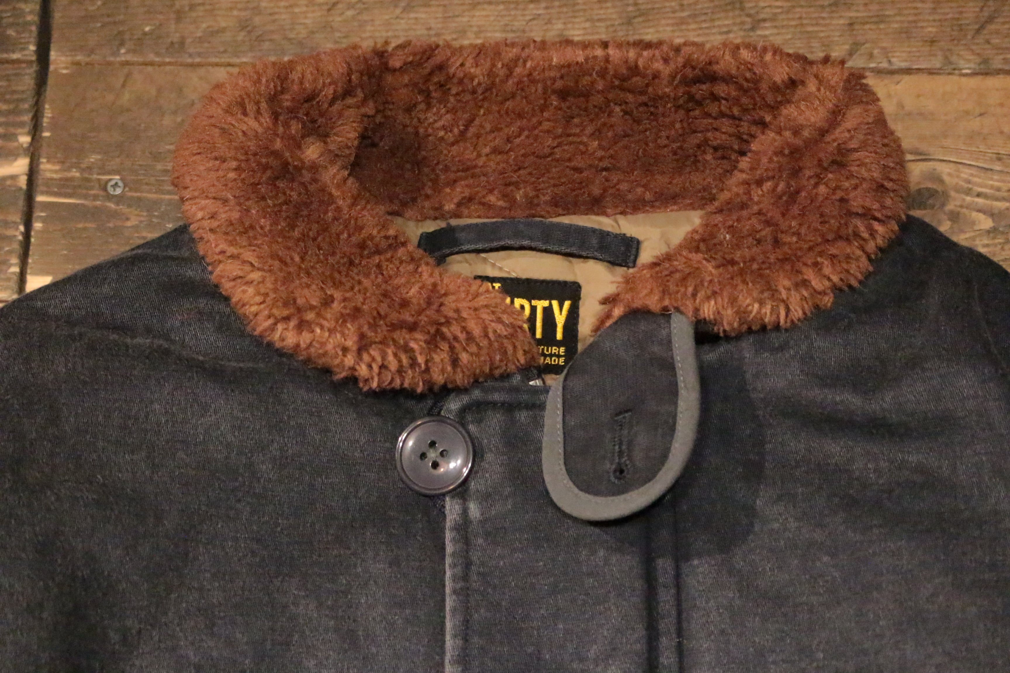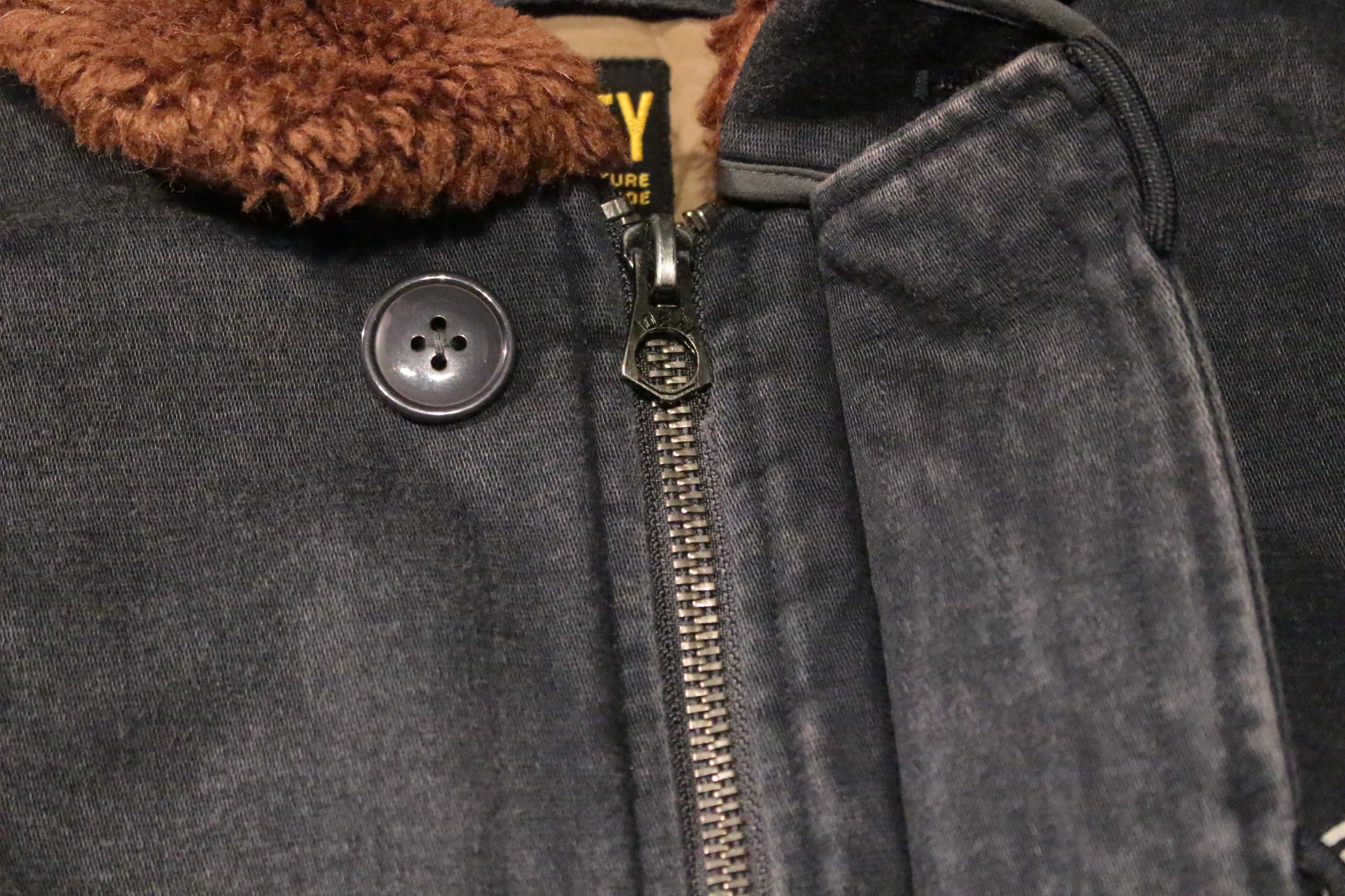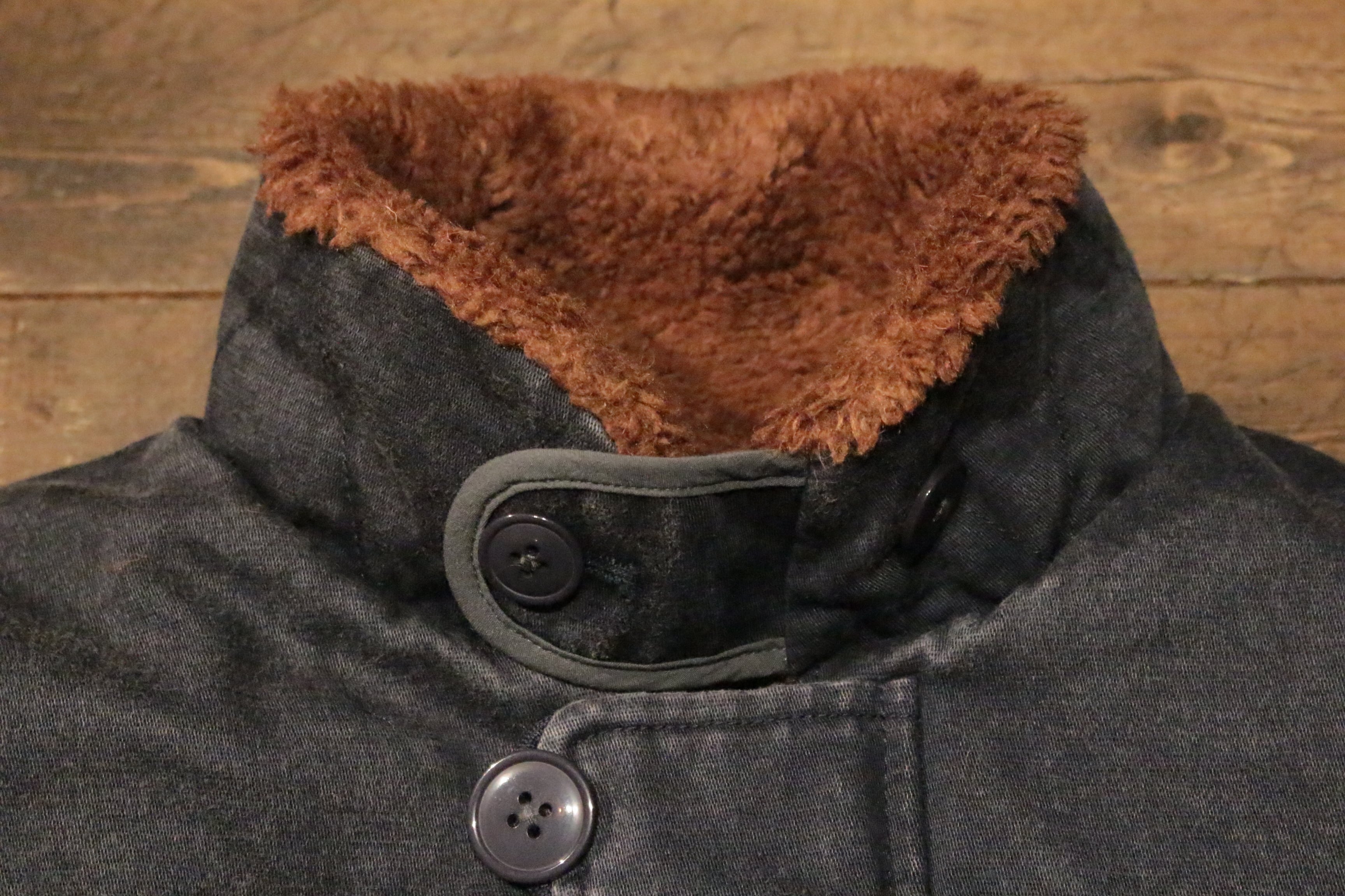 肌当たりのよ い襟ボアに、ストーンバイオ加工された荒々しい生地感が男らいい一着。