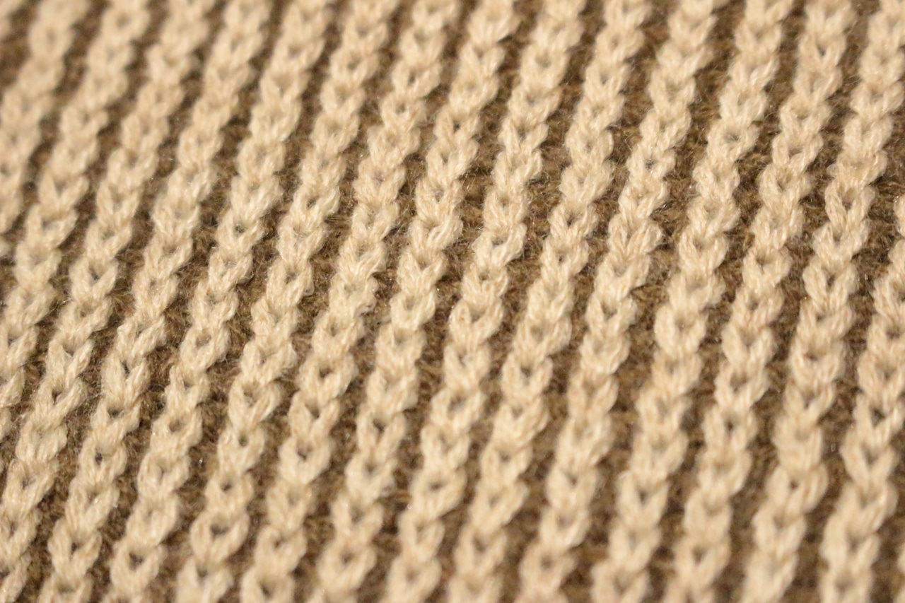 フィッシャーマンニット特有の毛玉ができにくいバルキー (膨らんだ)糸を使用。