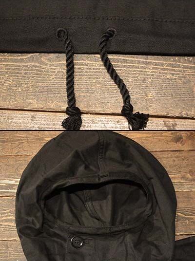 三層構造のメインボタンフライ、フード・裾のドローコード、30番綿糸での縫製、適所に施された裏環縫いによるステッチワークなど、ディテールにもこだわりを感じさせる一着。
