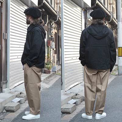 An outer parka reimagined in a big silhouette, based on the classic U.S. Navy smock parka. Made from vintage-style chino cloth, it retains the rugged military smock aesthetic. Features include a three-layer main button fly, drawcords at the hood and hem, stitching with 30-count cotton thread, and interior chain stitching in key areas―each detail reflects a deep commitment to craftsmanship.