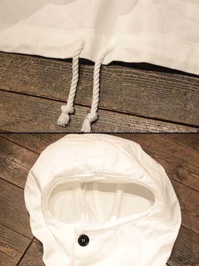 三層構造のメインボタンフライ、フード・裾のドローコード、30番綿糸での縫製、適所に施された裏環縫いによるステッチワークなど、ディテールにもこだわりを感じさせる一着。
