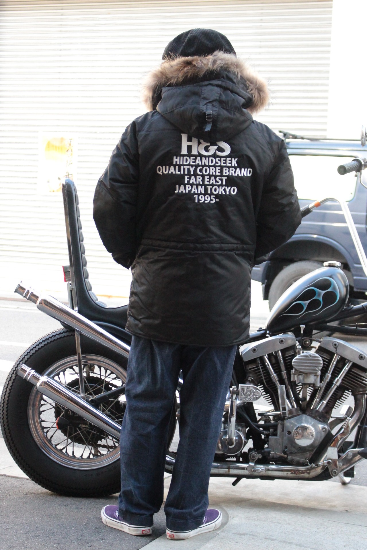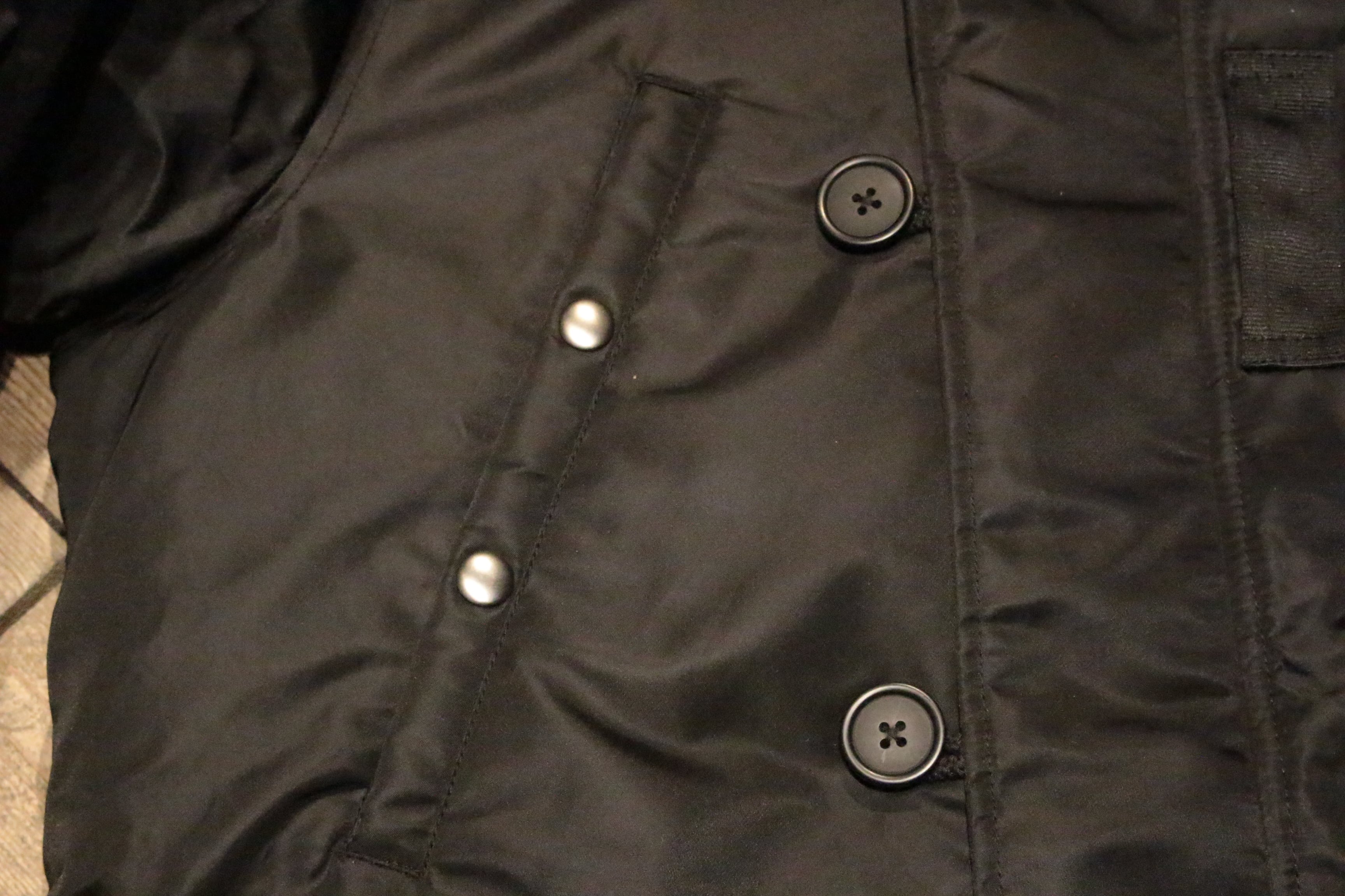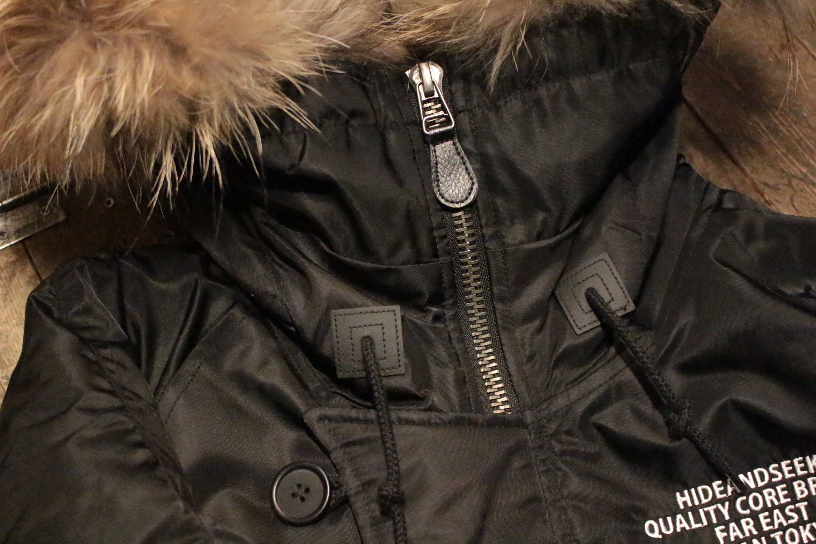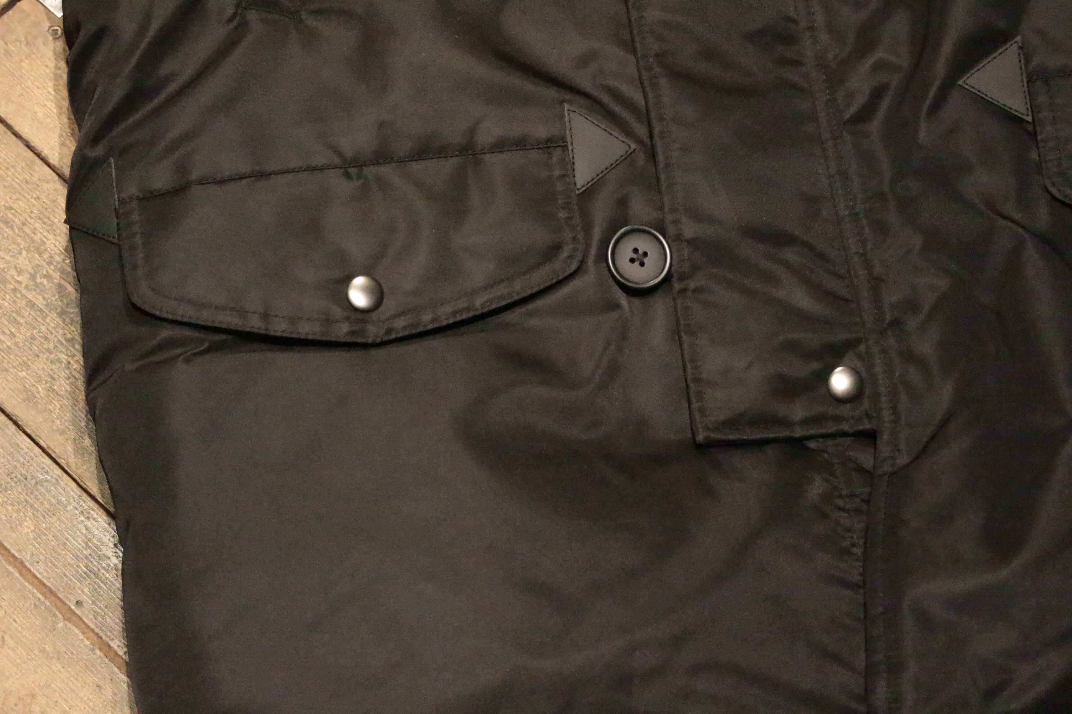 保温のための工夫が随所に散りばめられており、 手袋をしたままでポケットに物を出し入れしやすいように、かなり大きめに作られている。
