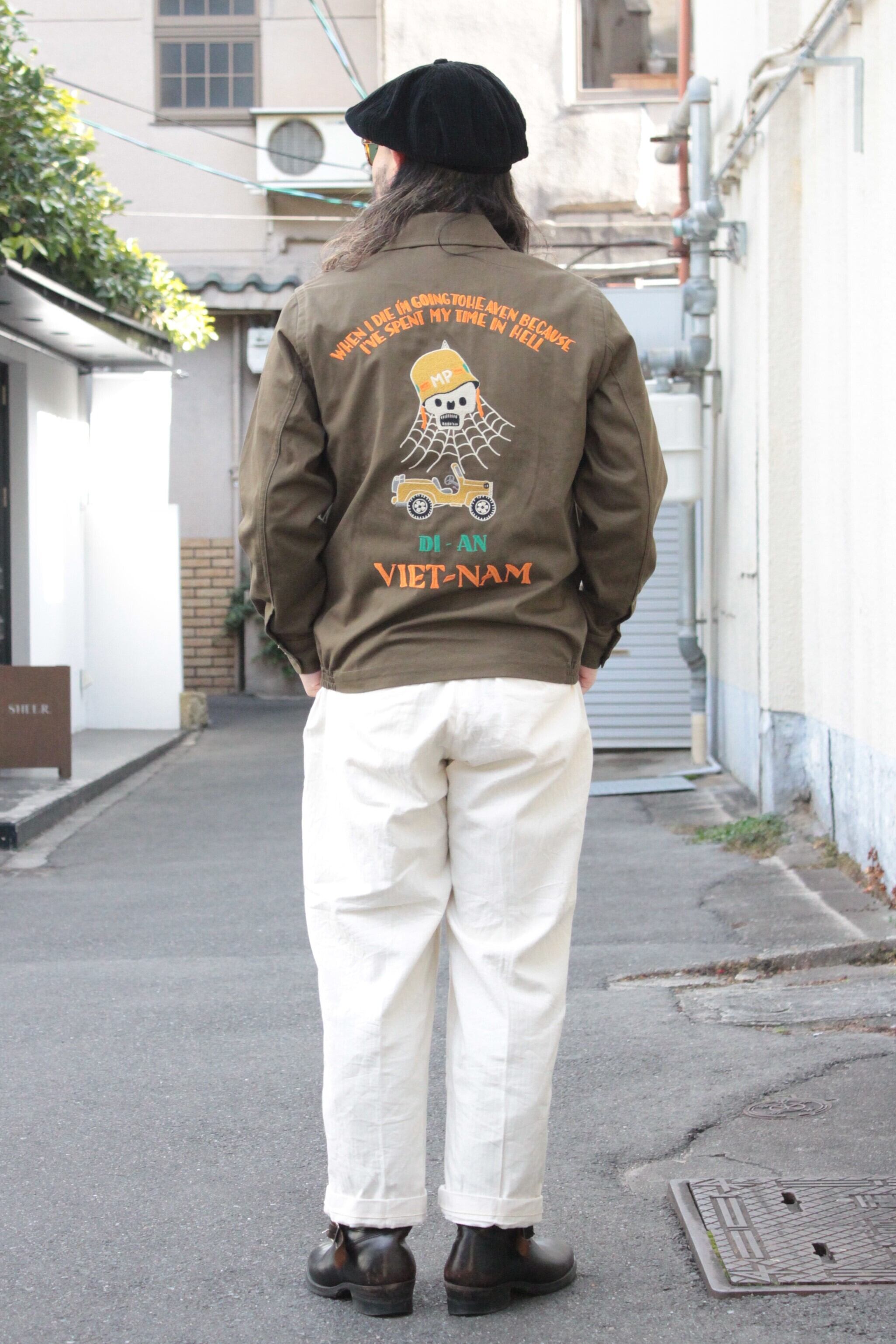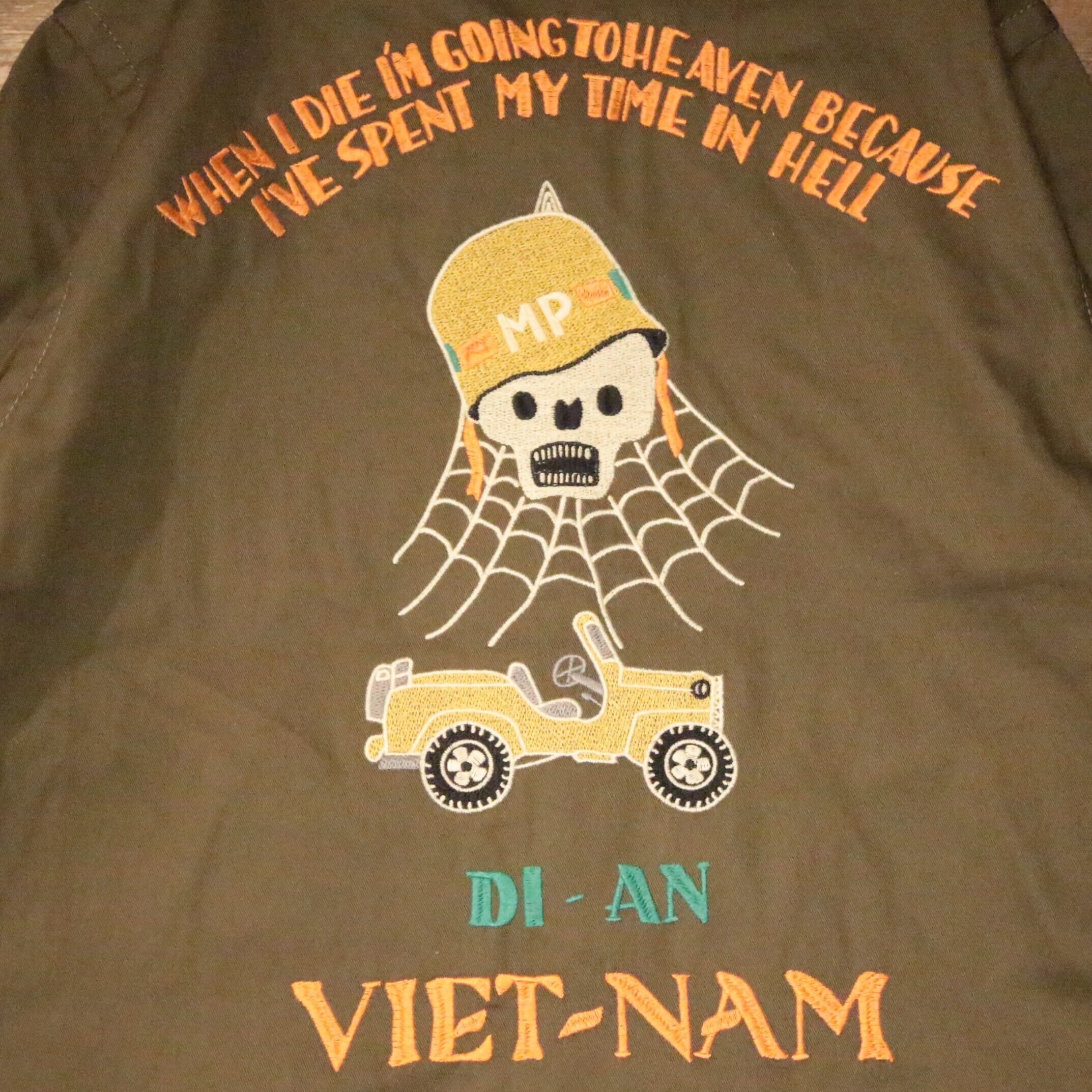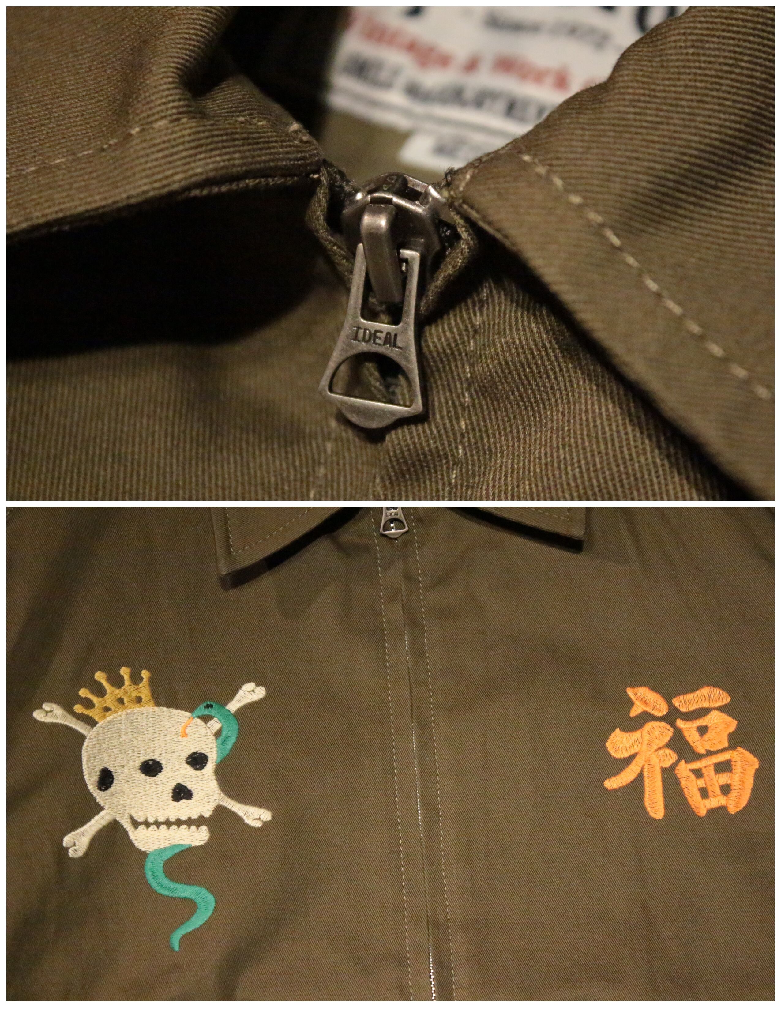 肉厚で丈夫なコットンツイル生地を使用したHOSUTON定番のベトナムジャケット。ヴィンテージベトジャンの柄をイメージし、全体に大きくインパクトのあるスカル柄を採用。手振りライクな刺繍で仕上げており、裏地なしのライトな仕様。
