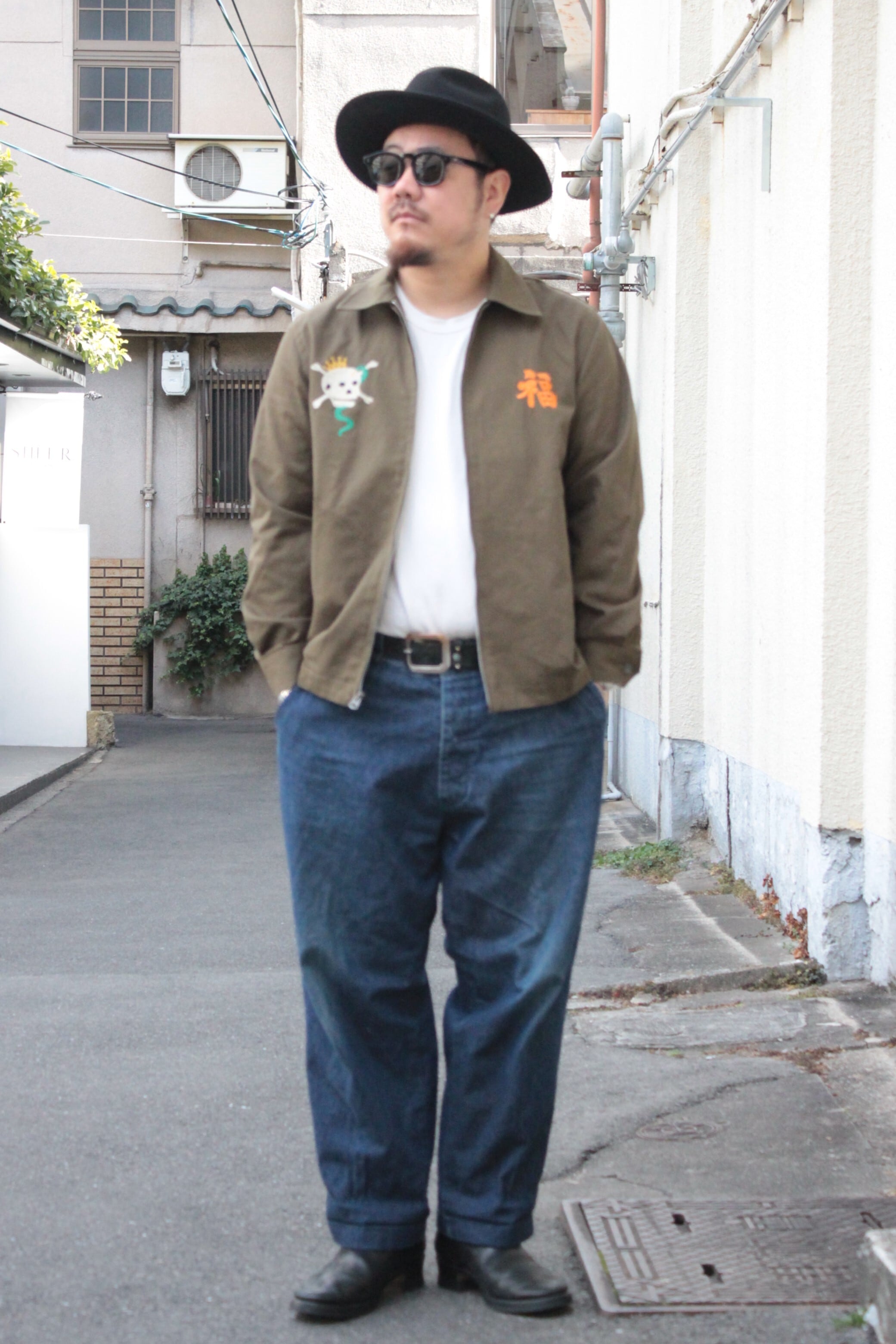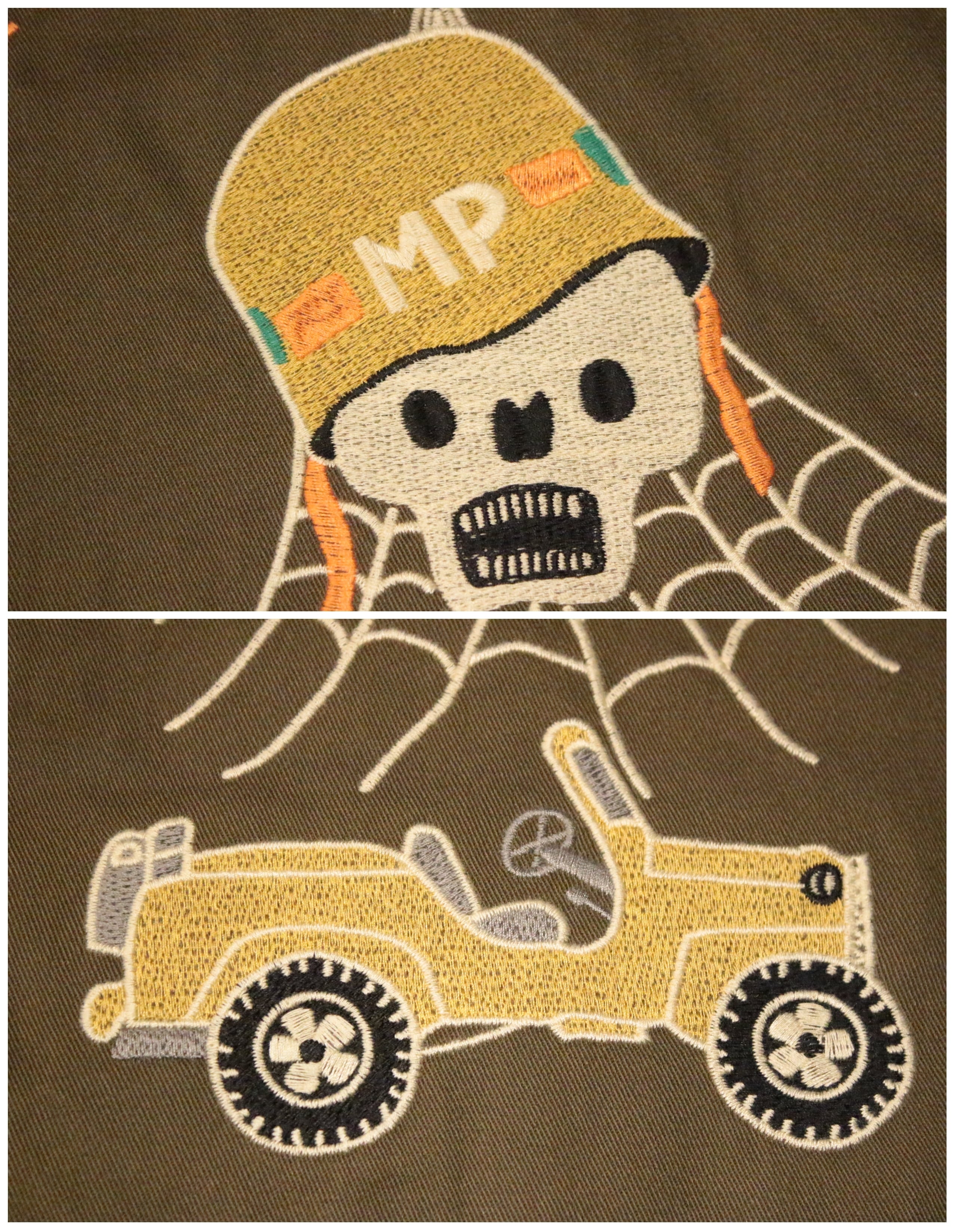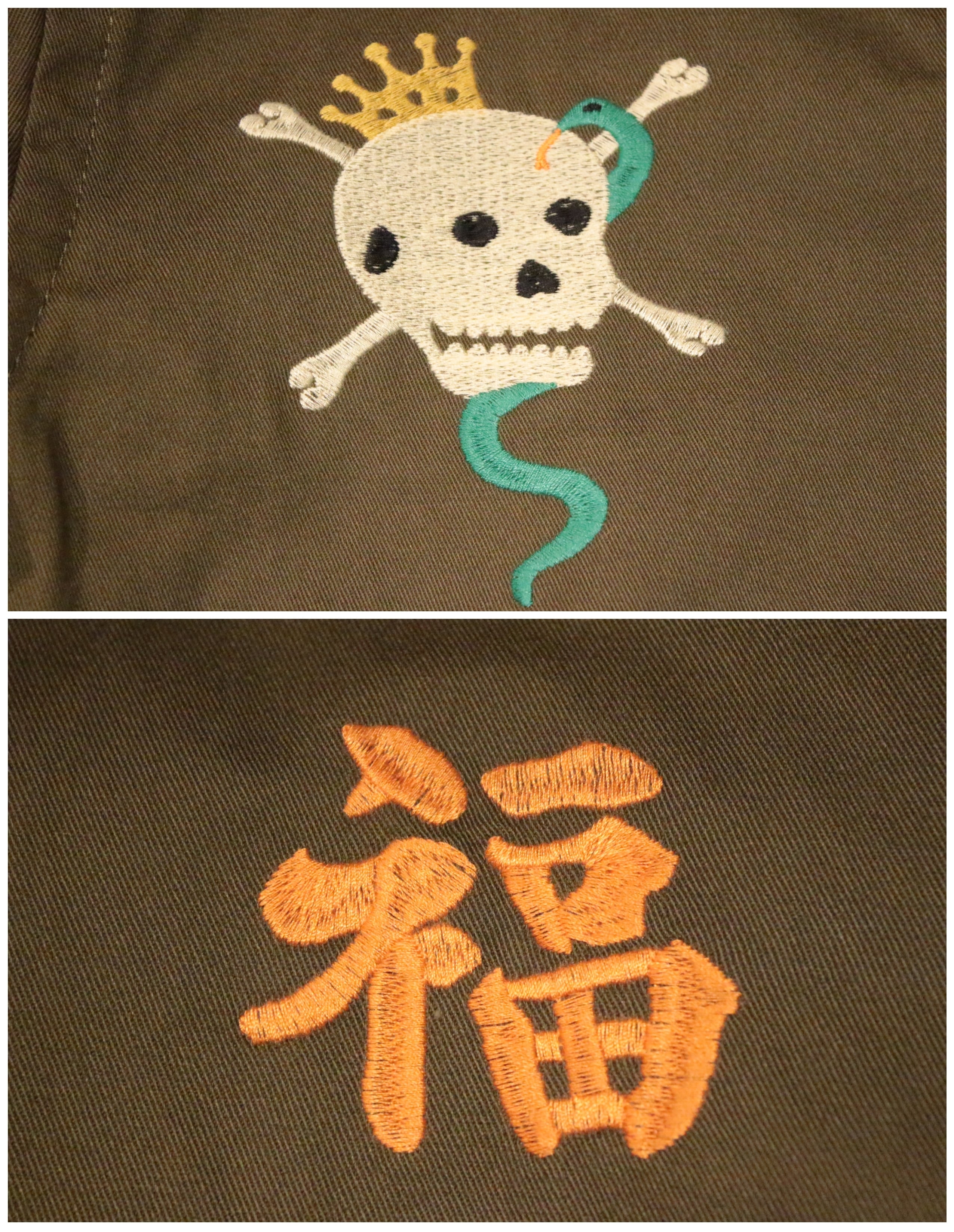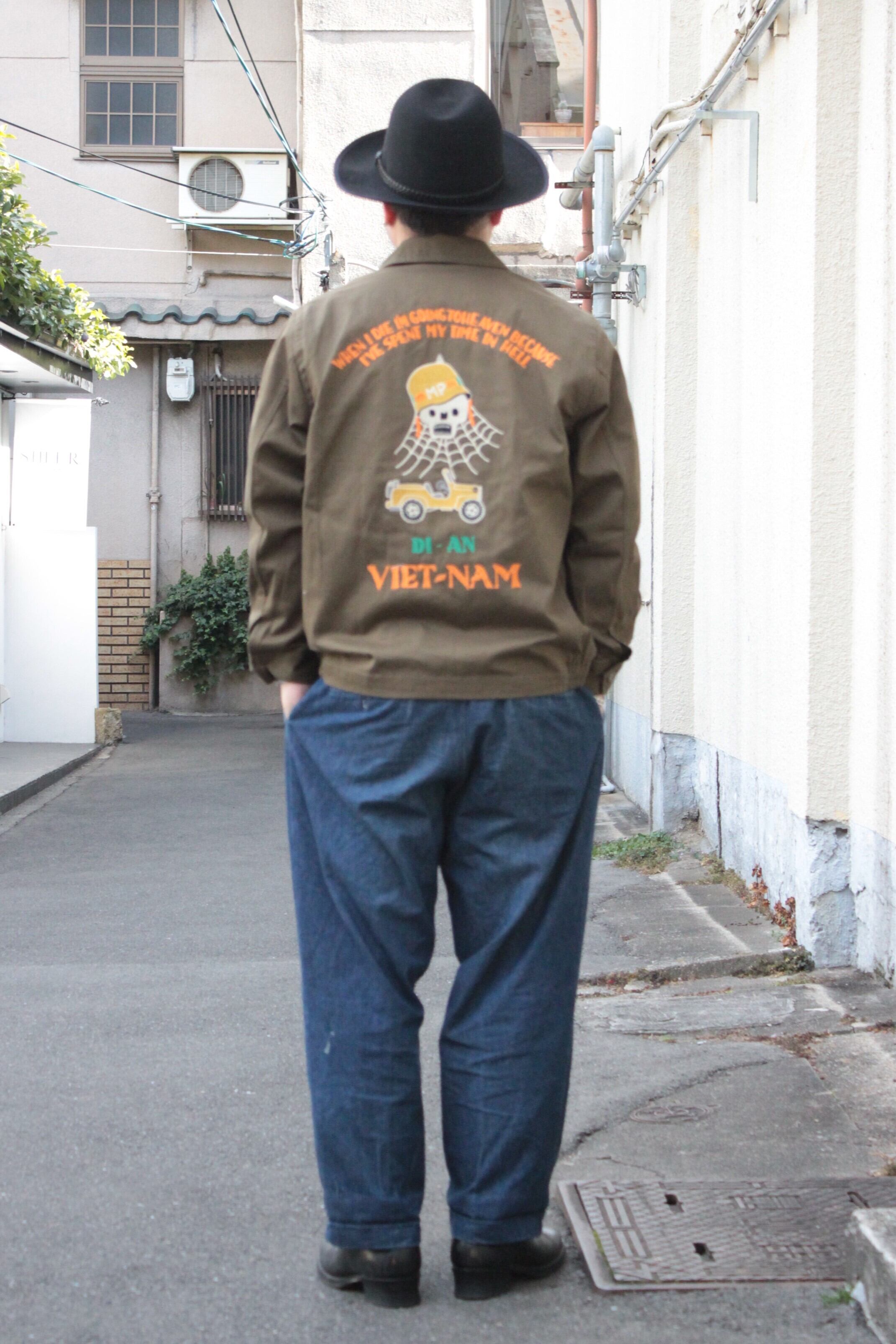 肉厚で丈夫なコットンツイル生地を使用したHOSUTON定番のベトナムジャケット。ヴィンテージベトジャンの柄をイメージし、全体に大きくインパクトのあるスカル柄を採用。手振りライクな刺繍で仕上げており、裏地なしのライトな仕様。