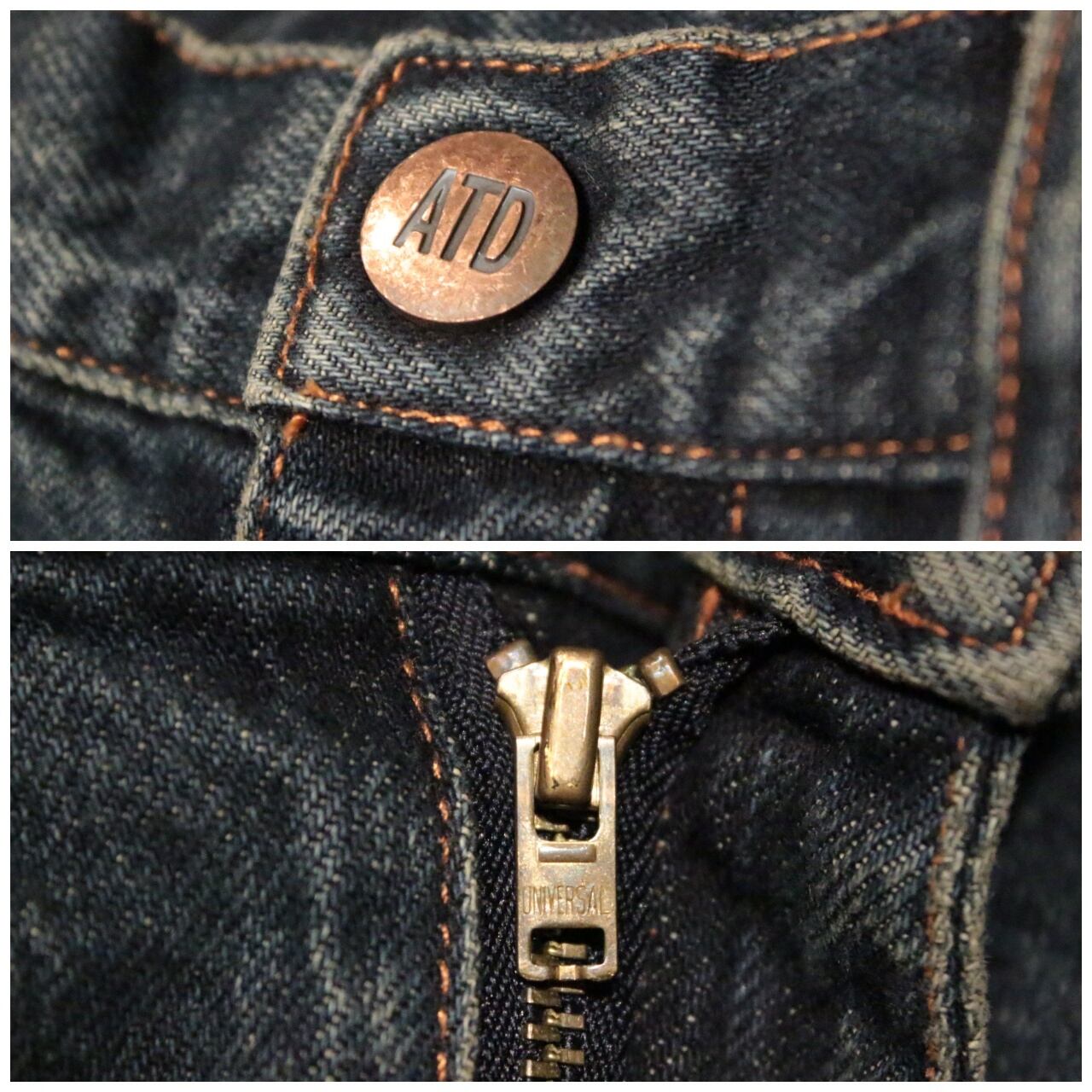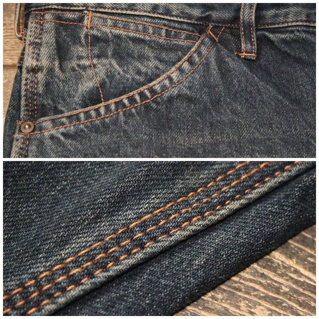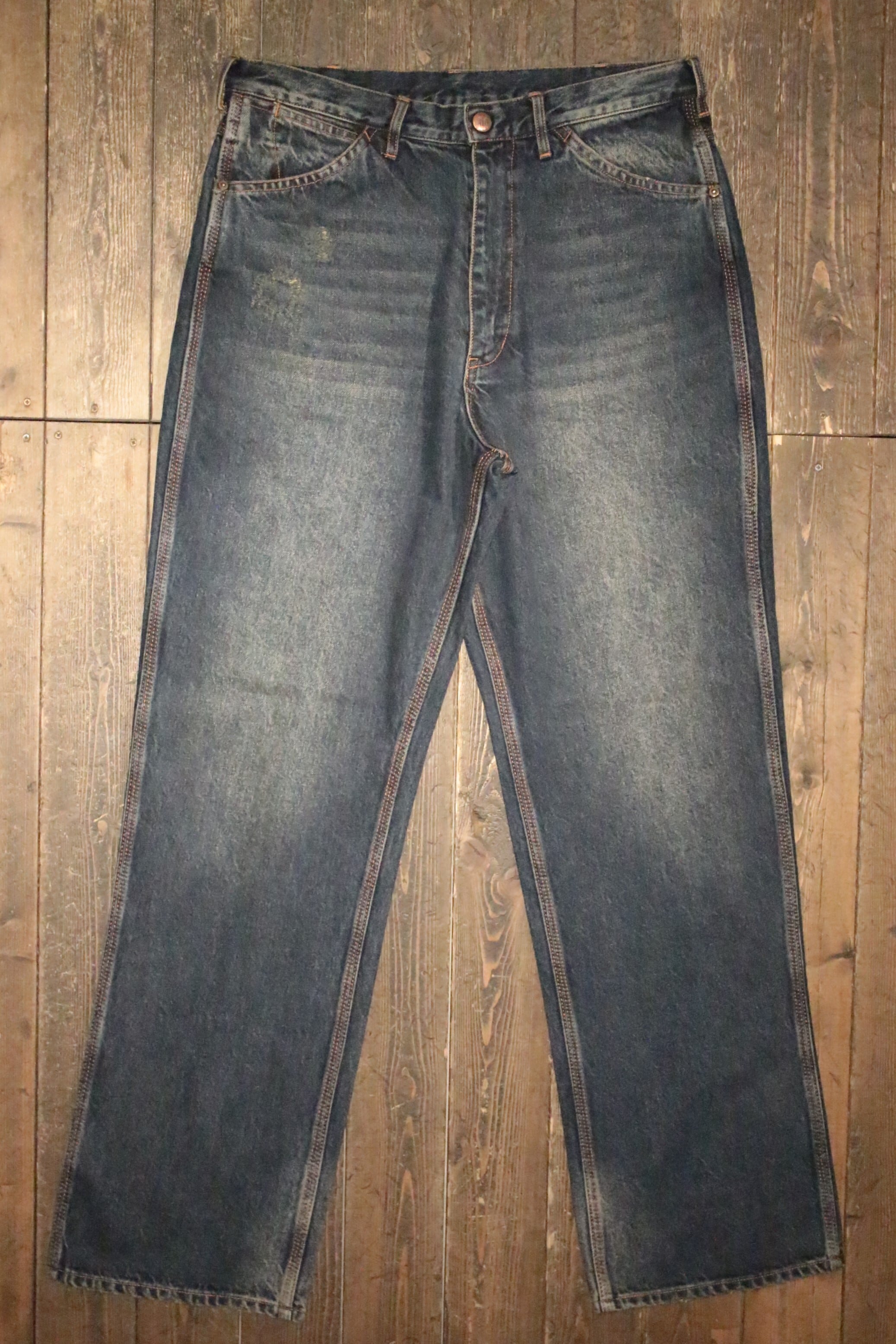 1950年代のストアブランドをデザインソースに製作。ペインターパンツを基に製作したパターンから本来のツールポケット、ハンマーループを取っ払った5ポケットパンツ。フロントのATDスナップボタン、オレンジステッチ、UFOリベット等、古き良きクラシックスタイルのワークパンツ(オリジナルスナップボタン使用)