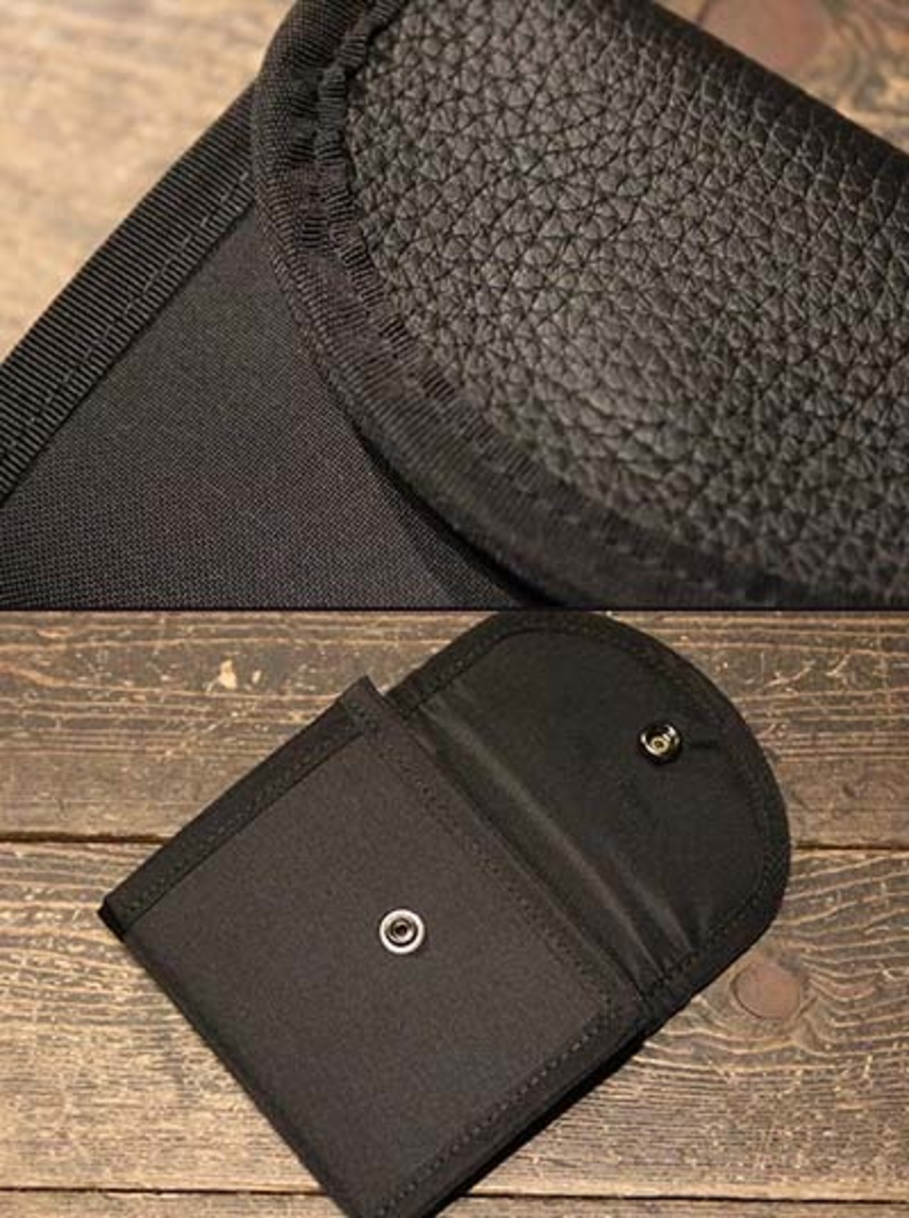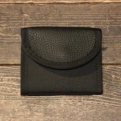 レザーとナイロンのコンビネーションが生む、モダンで上質な表情。機能性を高める複数のポケットを備え、コンパクトながらラグジュアリーな存在感を宿すブラックハーフウォレット。