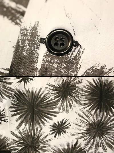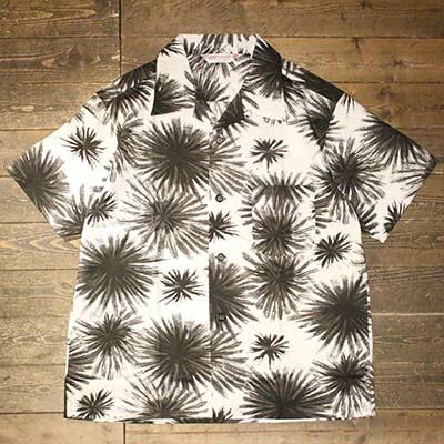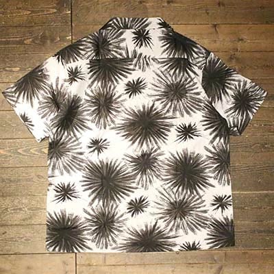 ブラックとグレーで描かれたモノトーンの花火モチーフが特徴の、ミッドセンチュリーの魅力漂う半袖シャツ。薄手のコットンブロードを使用し、ゆったりとしたボックスシルエットに仕上げた。裏環縫い二本針(4.8mm幅)のヴィンテージライクなステッチワークとナットボタンでクラシカルな上質感を表現。