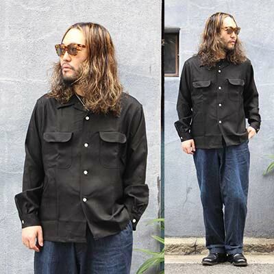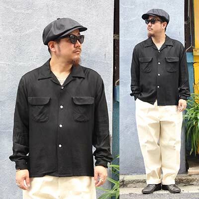 ヴィンテージを再現した独自開発のヘヴィウエイトレーヨンオックスを使用した、フラップポケット付きオープンカラー長袖シャツ。