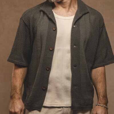 ワイドスプレッドカラーのコットンニットの半袖シャツ。